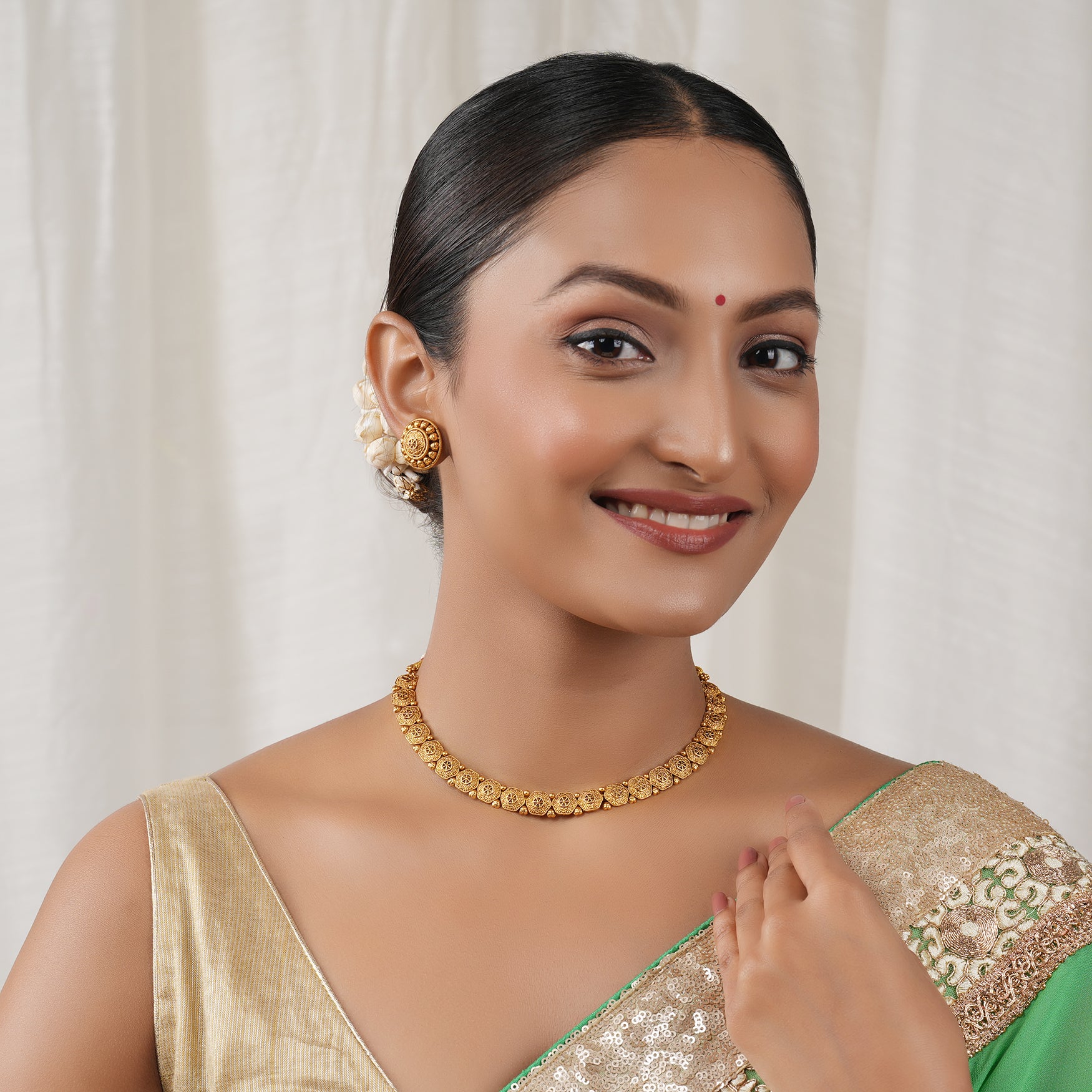 Cute elegant plain antique gold necklace set with earring   are show-stopping and come in traditional Indian design with gold plating and handwork.