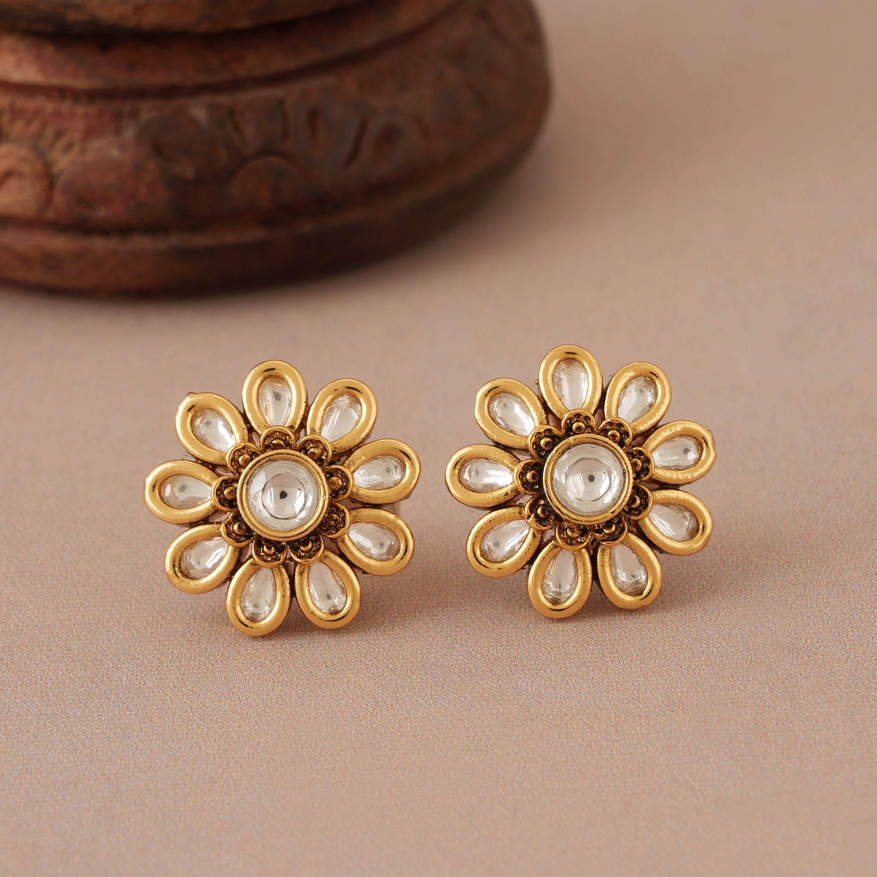 NOTE: These Cute floral kundan antique gold stud   for women have been crafted by hand and may have slight irregularities or imperfections in color or embellishment. These irregularities are the result of human involvement in the process and add to the finished product's charm while ensuring you have a one-of-a-kind piece.