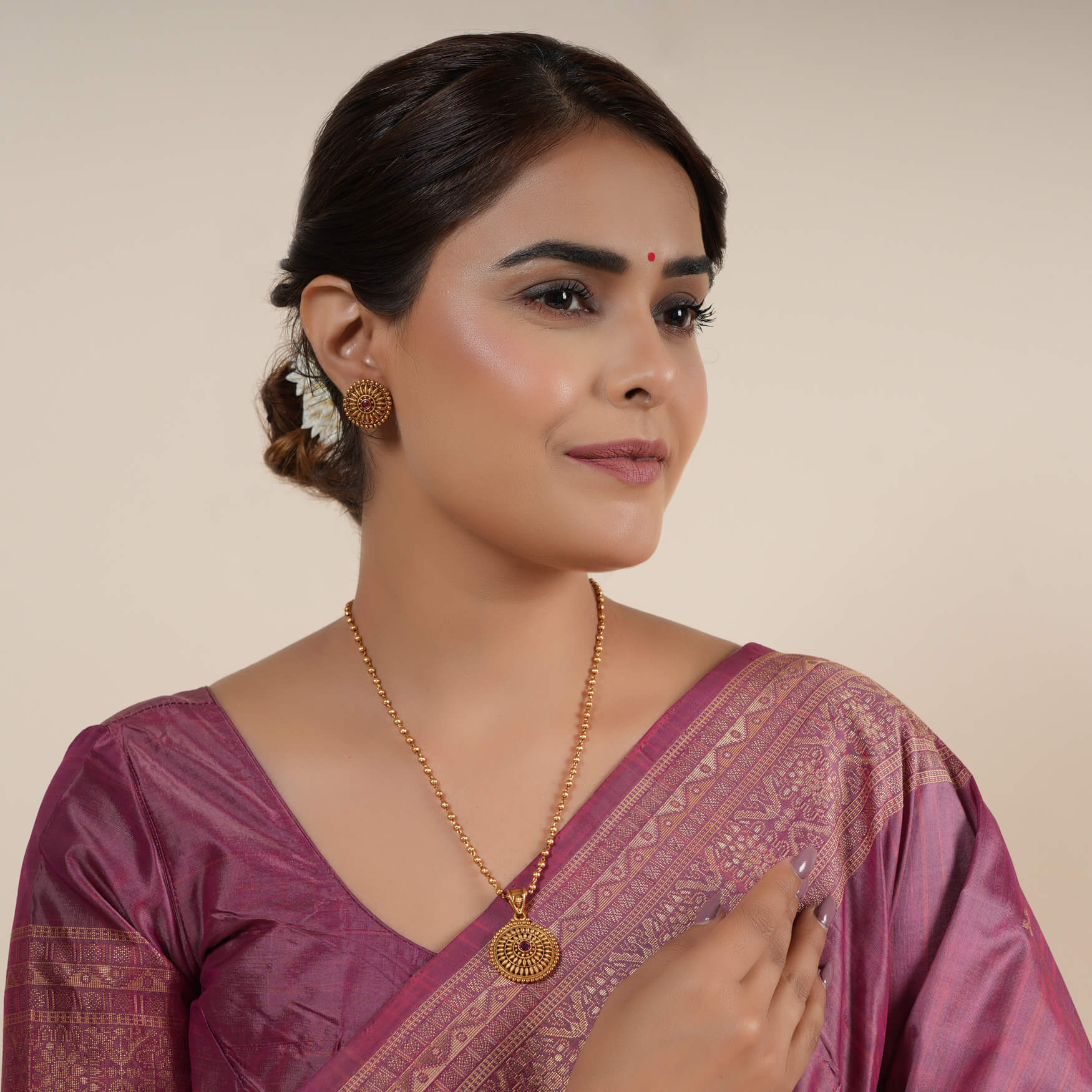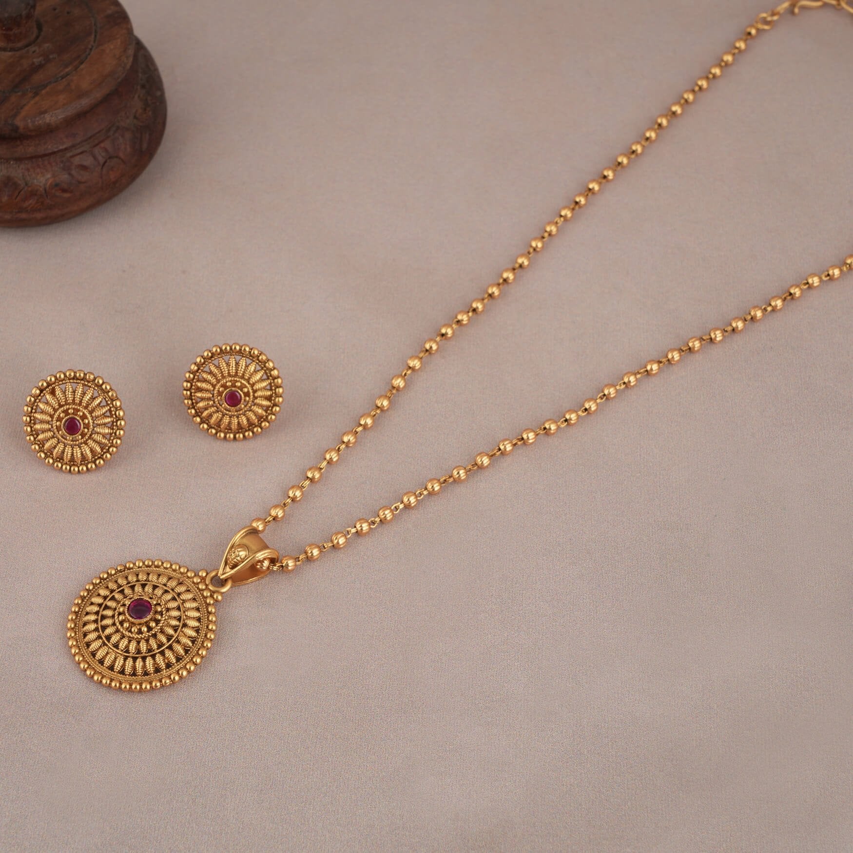 NOTE: This Cute gold finish floral ruby stone pendant set is has been crafted by hand and may have slight irregularities or imperfections in color or embellishment. These irregularities are the result of human involvement in the process and add to the finished product's charm while ensuring you have a one-of-a-kind piece.