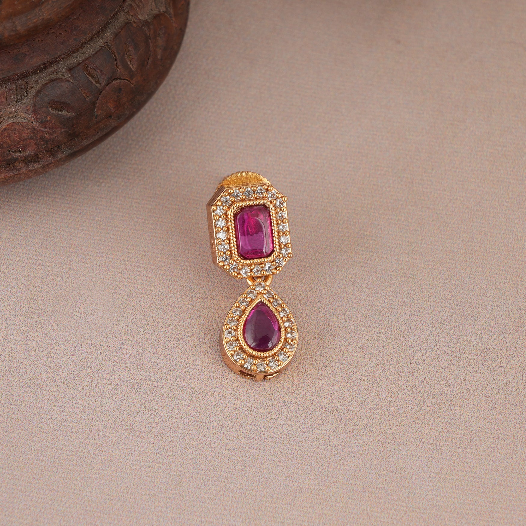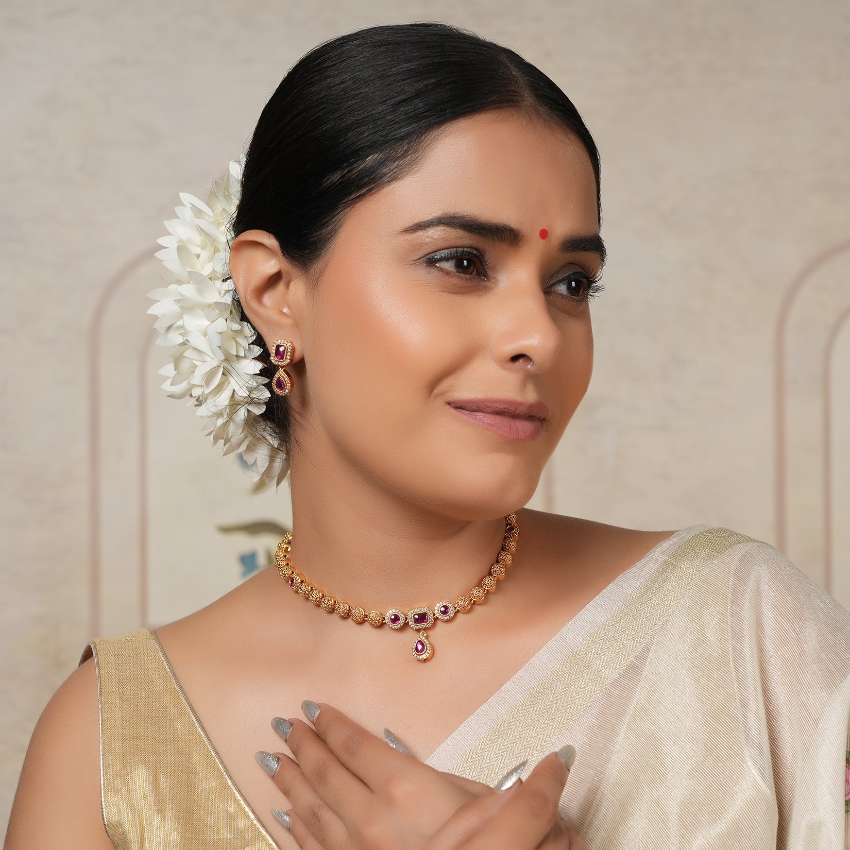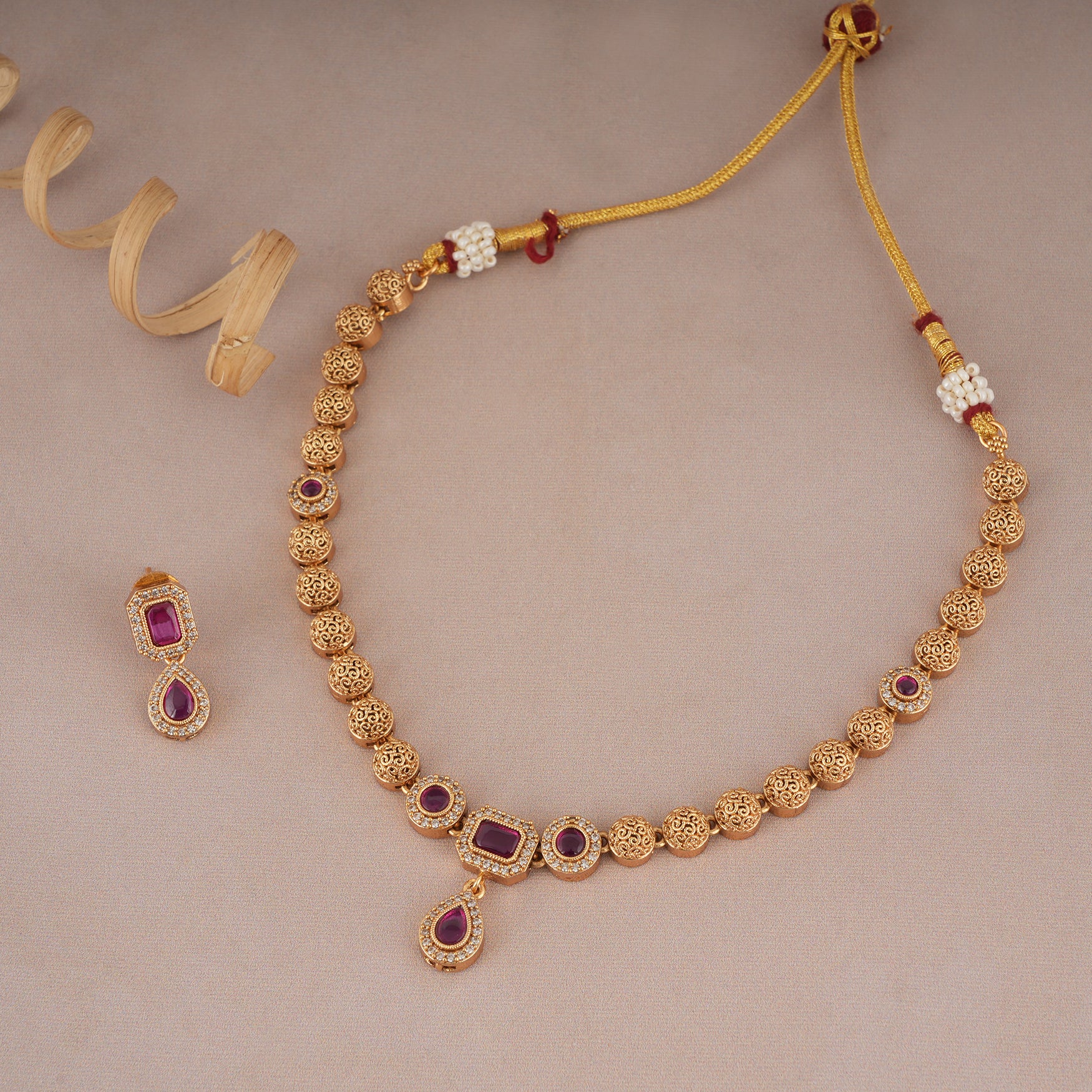 NOTE: This Cute gold plated ruby drop necklace set  has been crafted by hand and may have slight irregularities or imperfections in color or embellishment. These irregularities are the result of human involvement in the process and add to the finished product's charm while ensuring you have a one-of-a-kind piece.