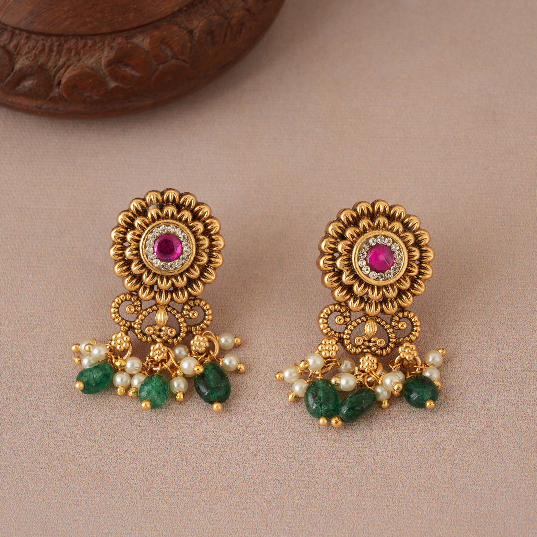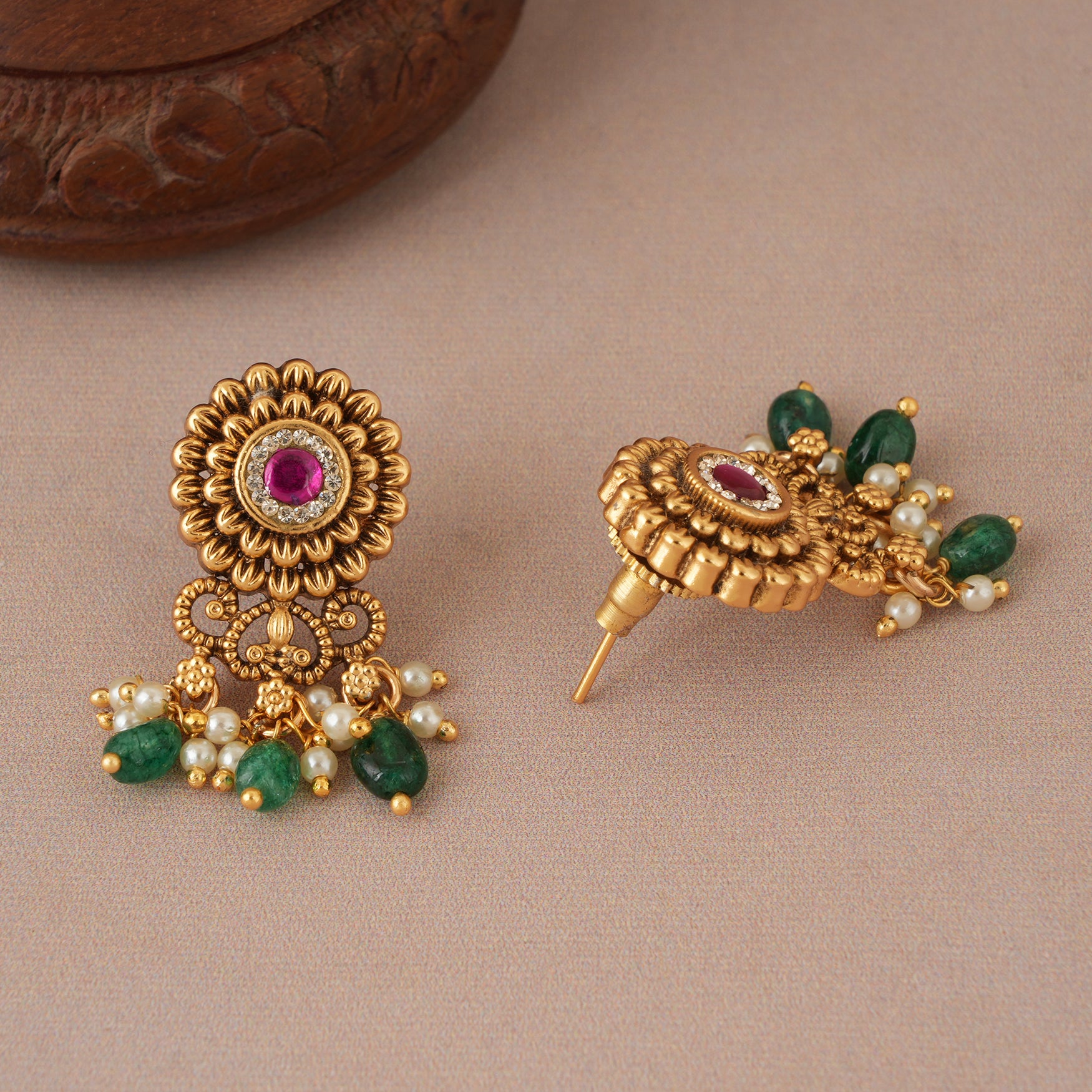 NOTE: These Cute kundan stone antique gold floral earring  been crafted by hand and may have slight irregularities or imperfections in colour or embellishment. These irregularities are the result of human involvement in the process and add to the finished product's charm while ensuring you have a one-of-a-kind piece.