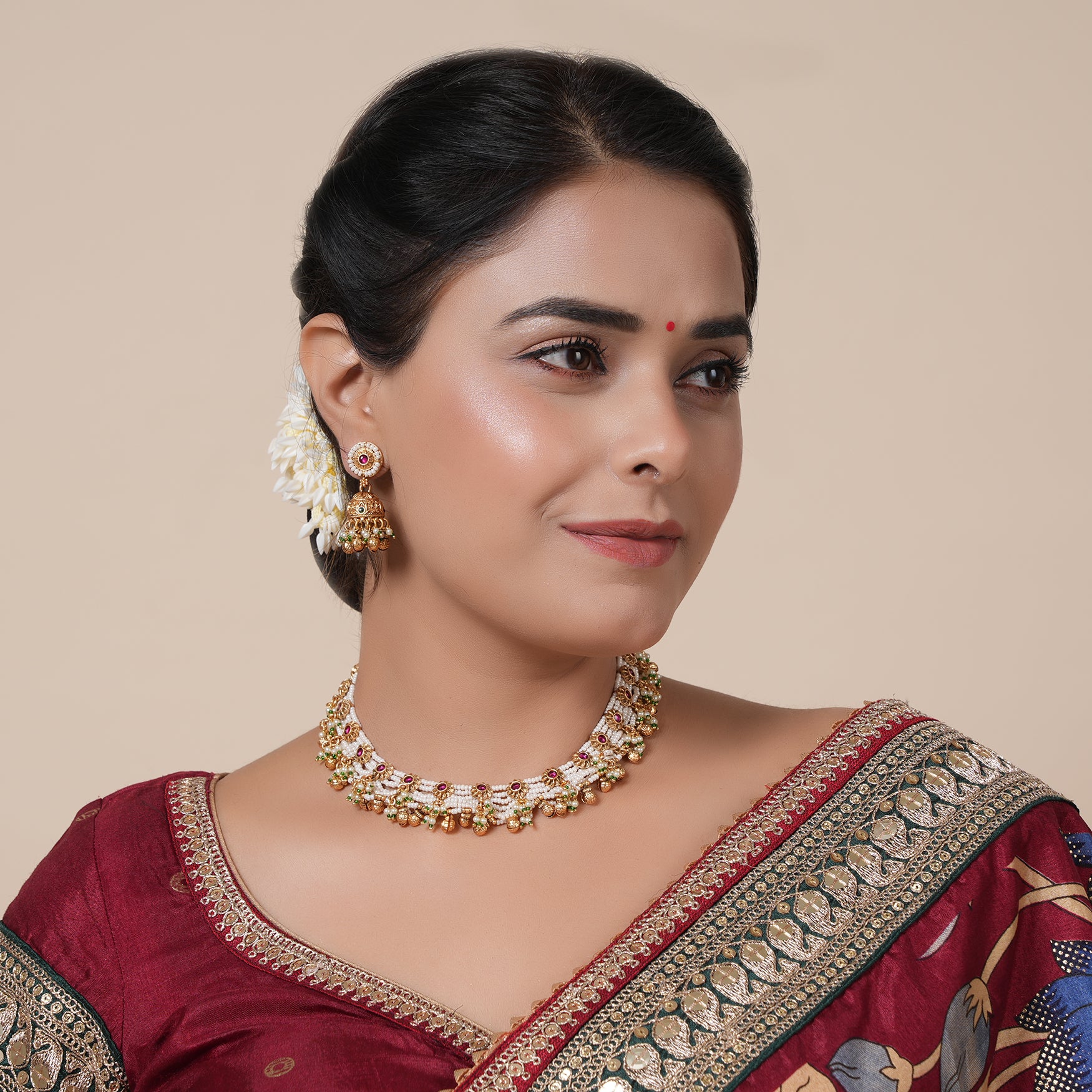 Cute pearl stone gold plated necklace set for women is a show-stopping, traditional Indian necklace set with gold plating and handwork.