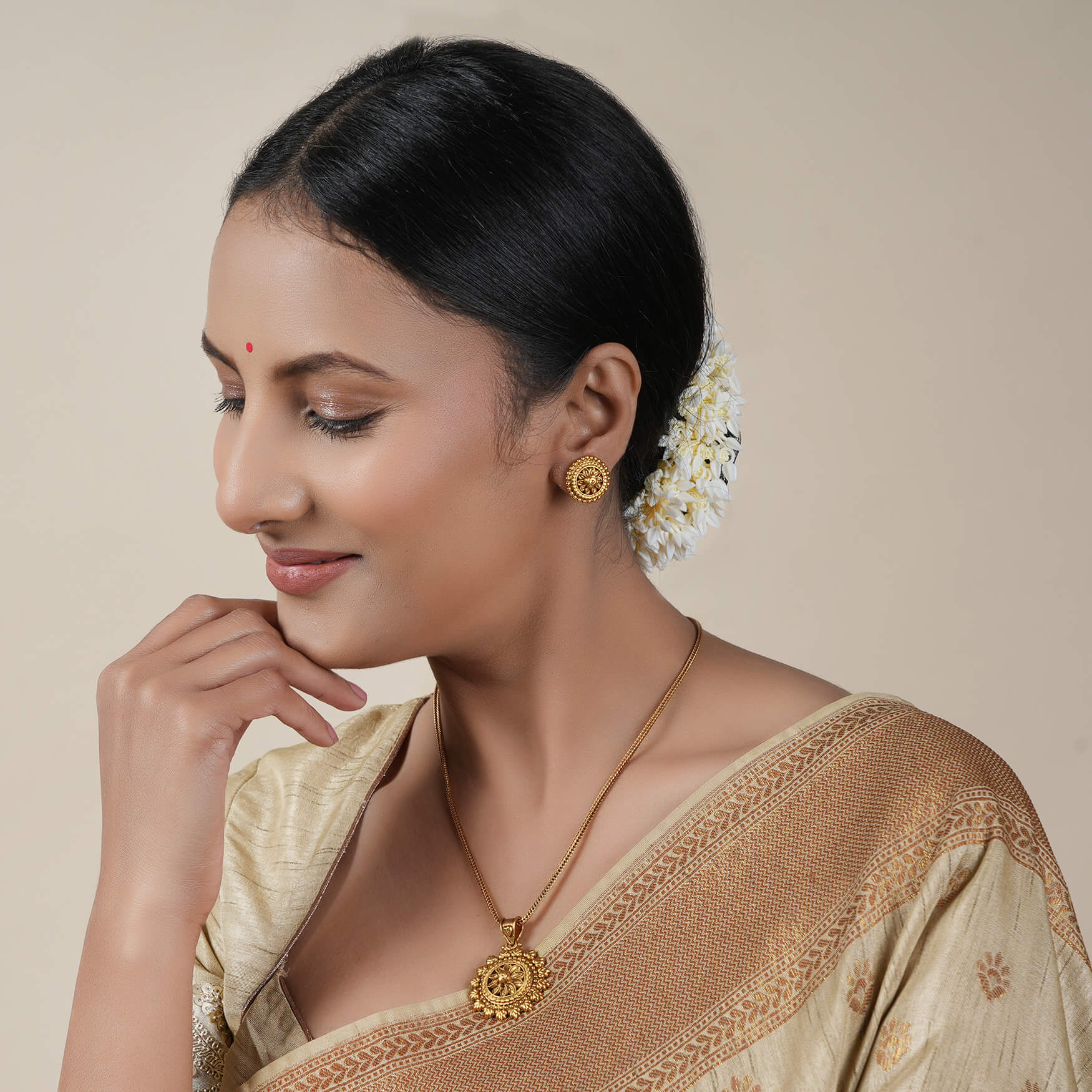 Cute sleek antique gold plated pendant set    is made of brass alloy with gold plating. The necklace length is 22 inches, and the necklace lock is a drawing string. The earrings are 0.6 inch long, and its lock is a push-back. This set comes with beautiful pair of matching earrings Cute sleek antique gold plated pendant set    is a show-stopping, traditional Indian necklace set with gold plating and handwork. Buy this Cute sleek antique gold plated pendant set  is and get free shipping even on Cash on Delivery