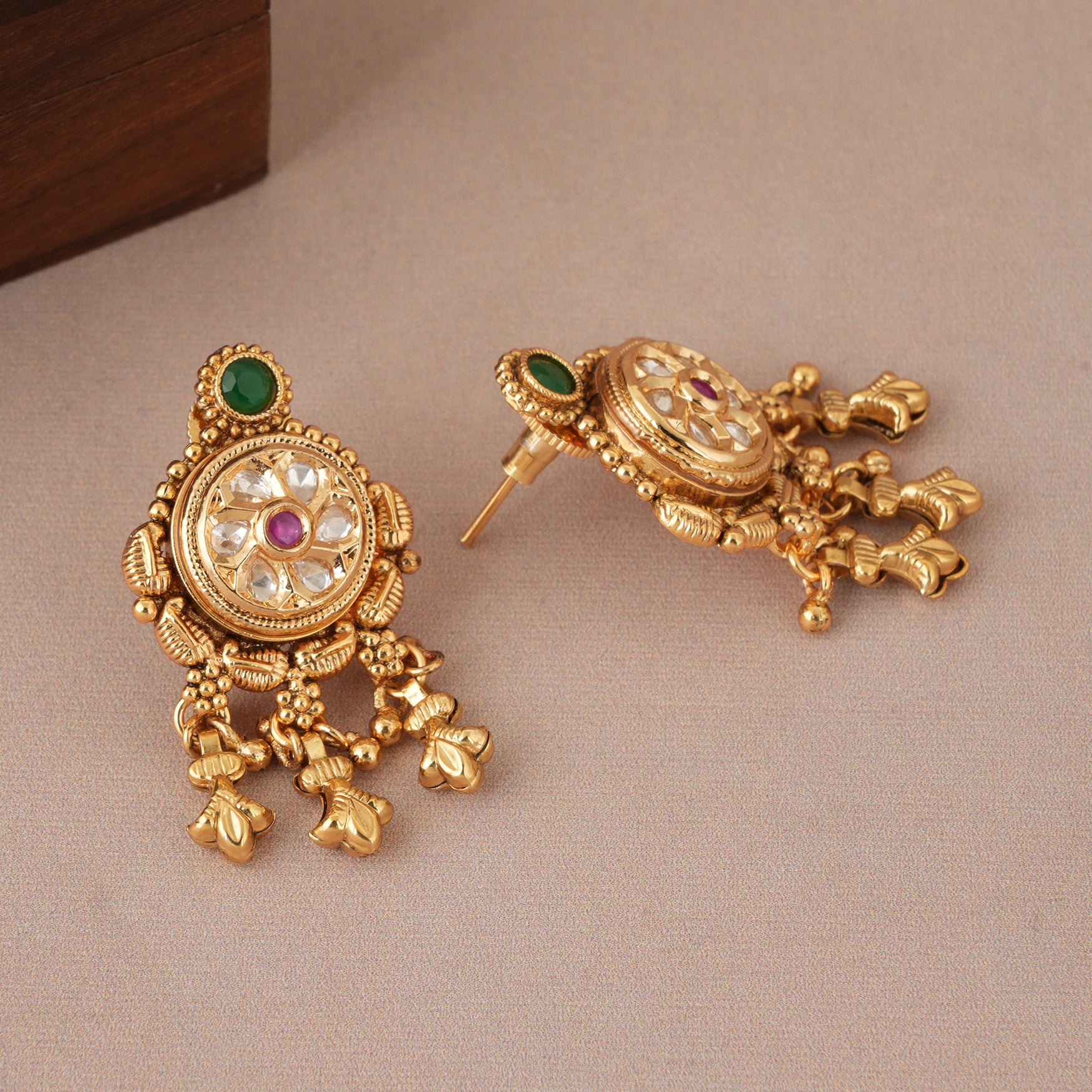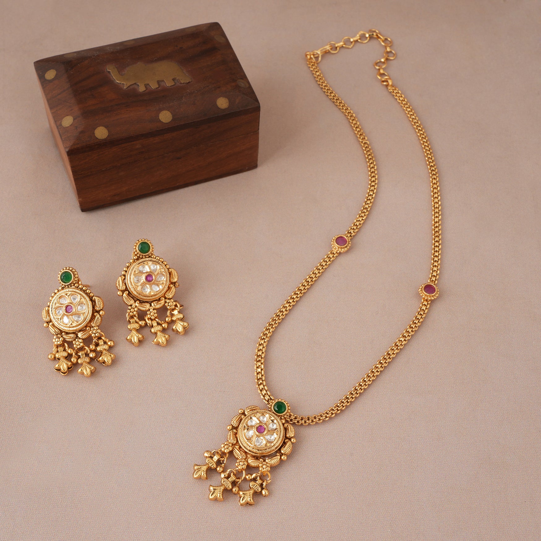 Cute stunning antique gold kundan stone pendant set is a show-stopping, traditional Indian necklace set with gold plating and handwork. Buy Cute stunning antique gold kundan stone pendant set and get free shipping even on Cash on Delivery.