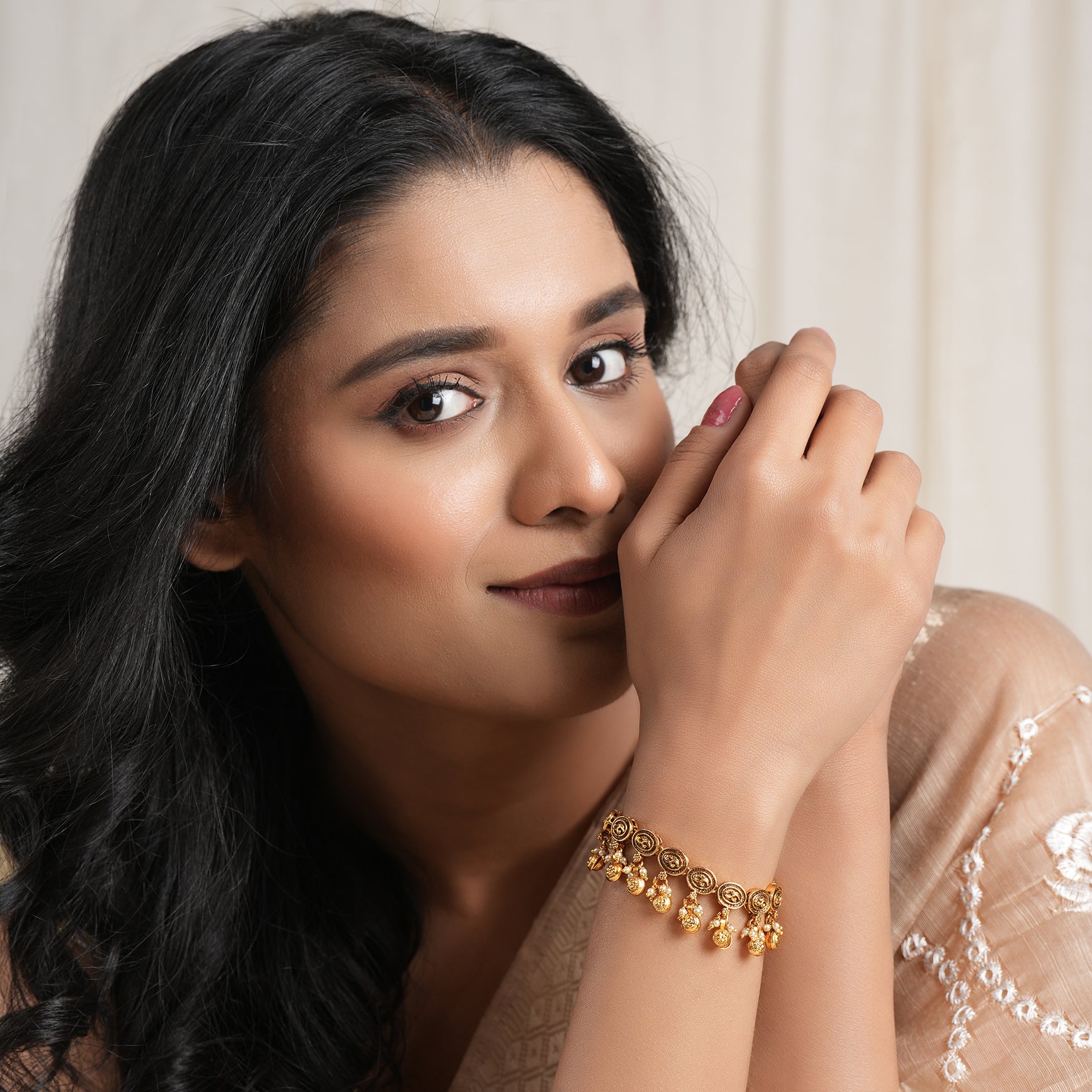 This Delicate antique gold pearl bracelet is show-stopping and comes in traditional Indian design with gold plating and handwork. Buy this Delicate antique gold pearl bracelet and get free shipping, even on Cash on Delivery.