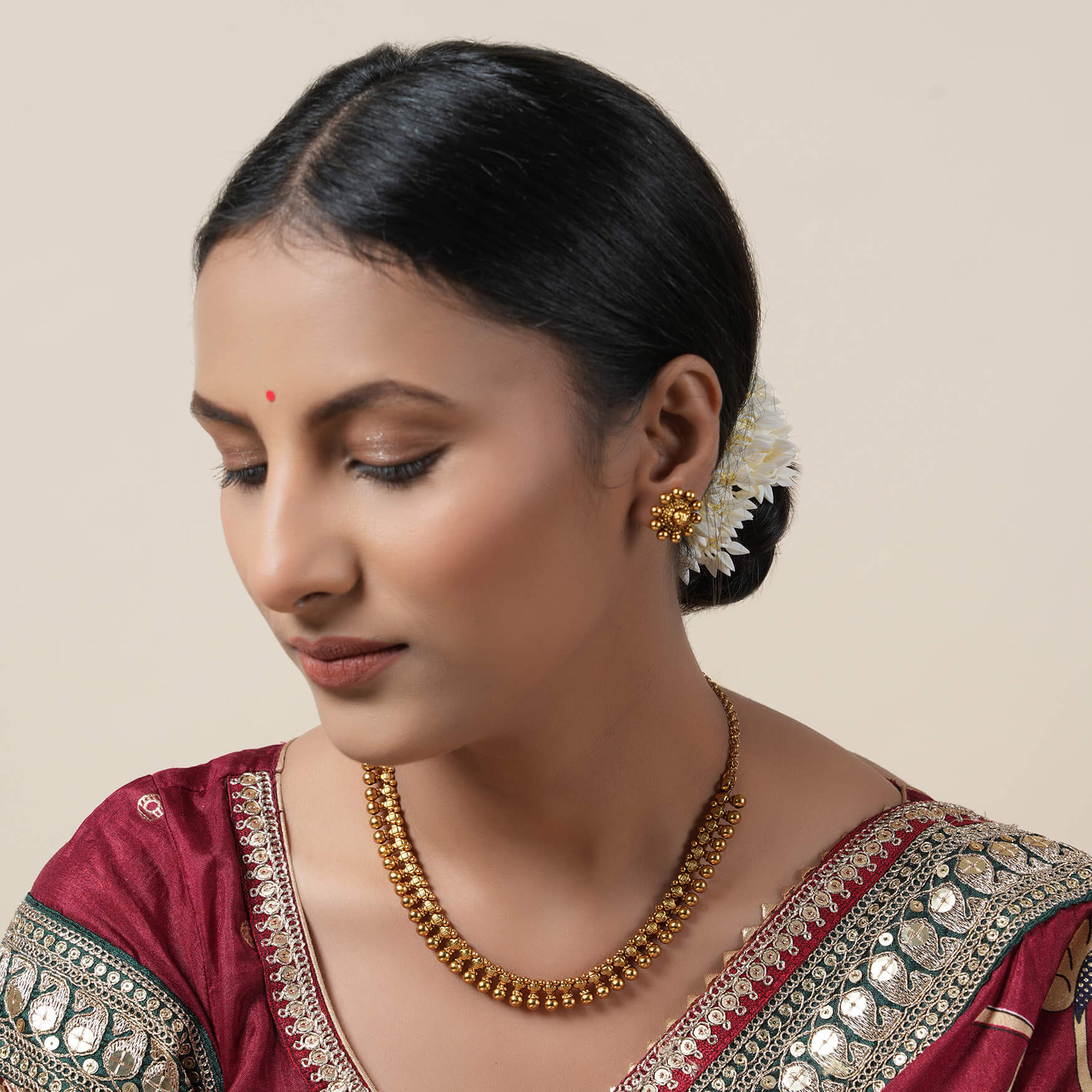 NOTE: Delicate antique gold plated plain balls necklace set for women is has been crafted by hand and may have slight irregularities or imperfections in color or embellishment. These irregularities are the result of human involvement in the process and add to the finished product's charm while ensuring you have a one-of-a-kind piece.
