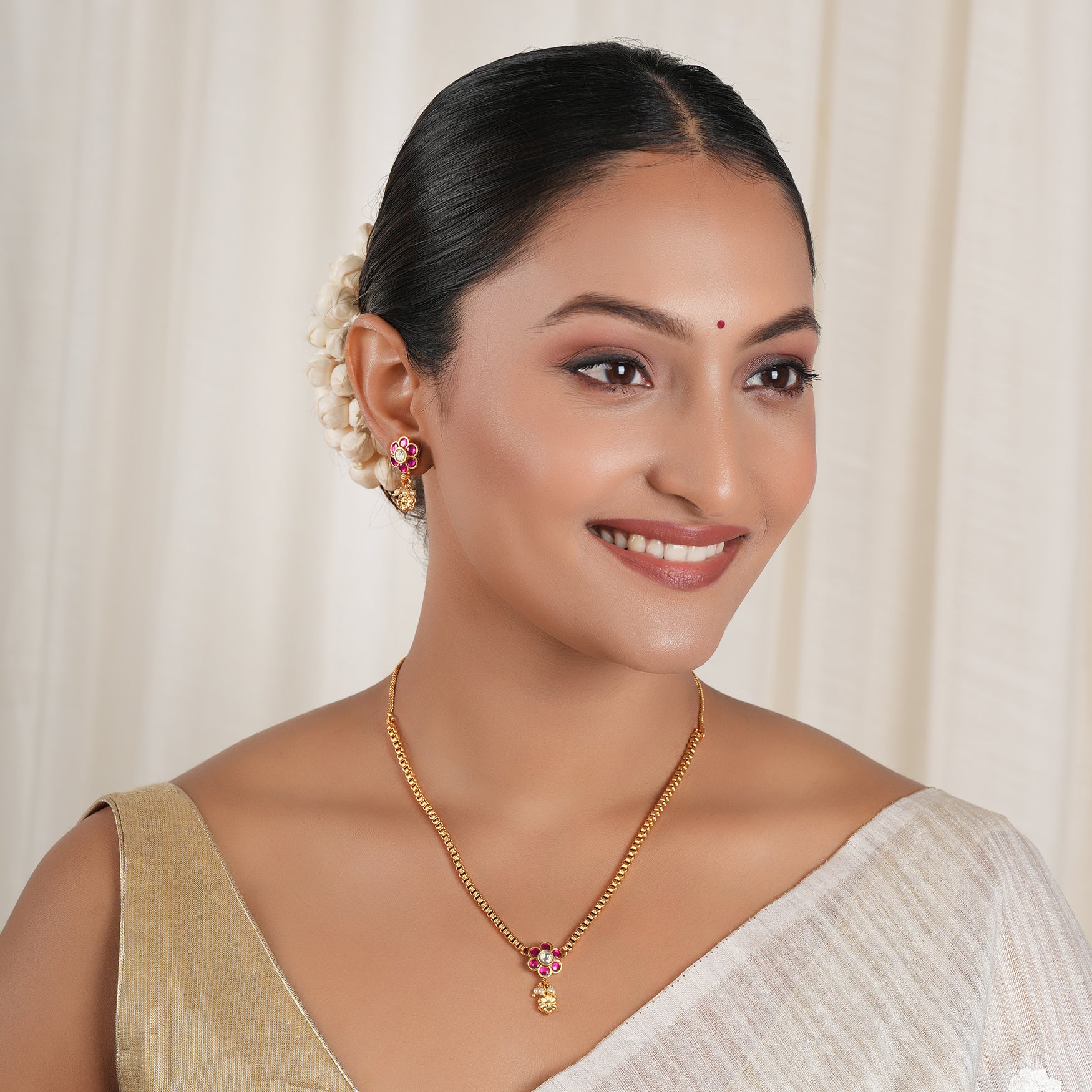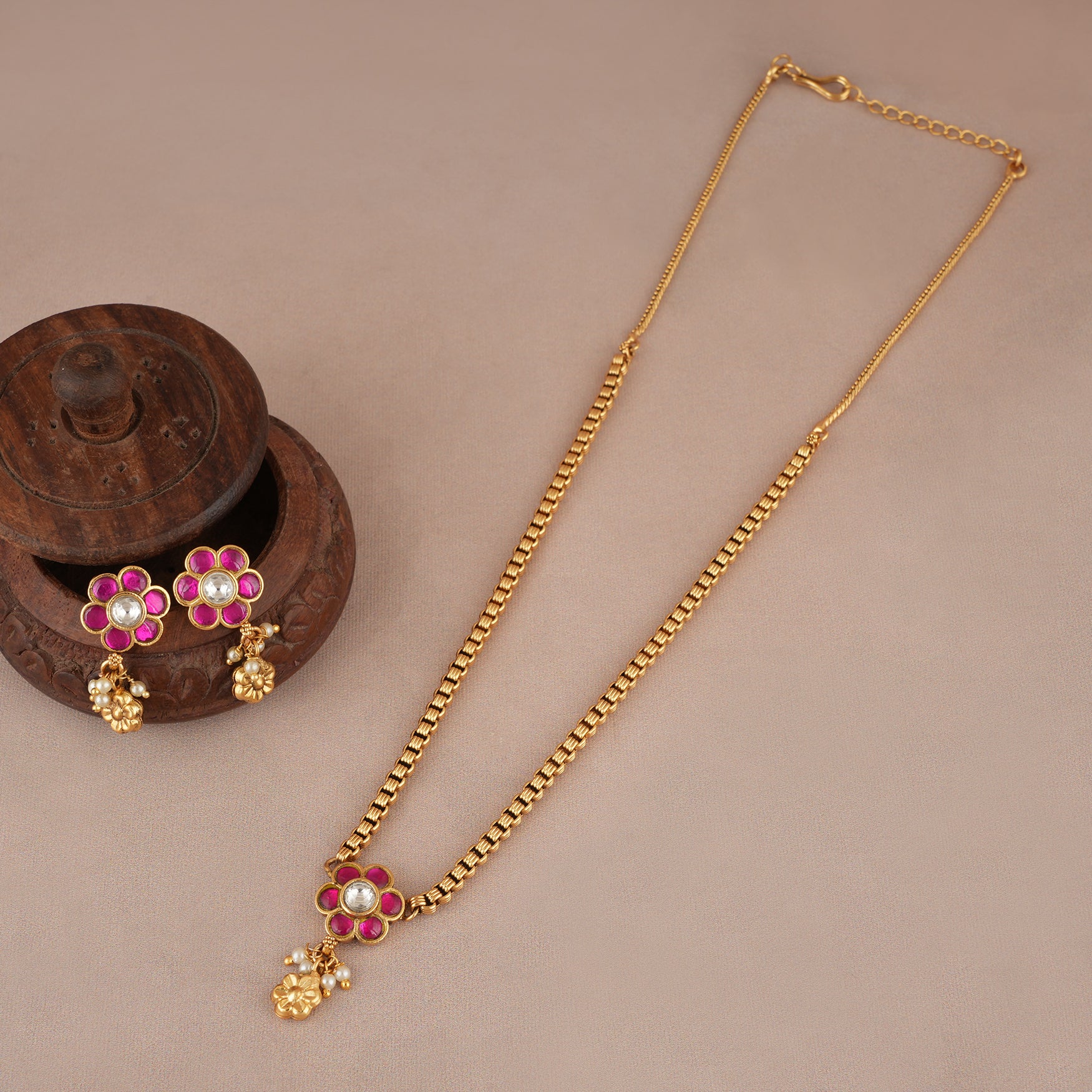 Delicate floral antique gold stone pendant necklace set  is a show-stopping, traditional Indian necklace set with gold plating and handwork. Buy Delicate floral antique gold stone pendant necklace set   and get free shipping even on Cash on Delivery