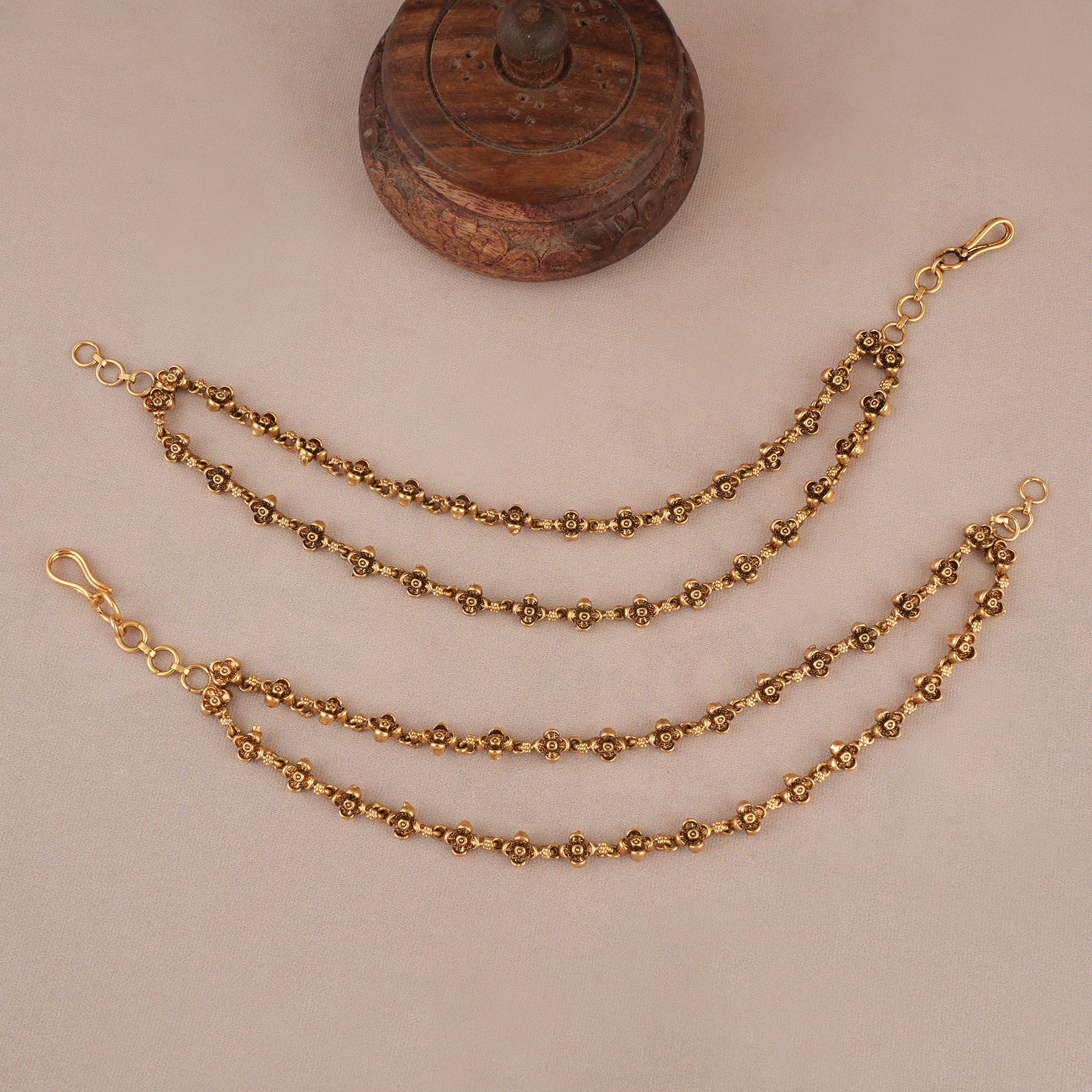 NOTE: This Elegant floral two layer antique gold ear chain has been crafted by hand and may have slight irregularities or imperfections in color or embellishment.