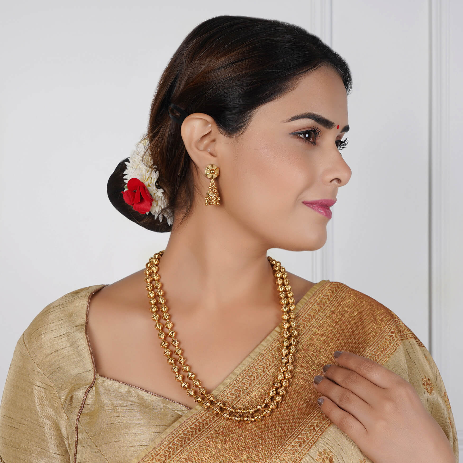 NOTE: This  Gold finish two lines balls mala set has been crafted by hand and may have slight irregularities or imperfections in colour or embellishment. These irregularities are the result of human involvement in the process and add to the finished product's charm while ensuring you have a one-of-a-kind piece.