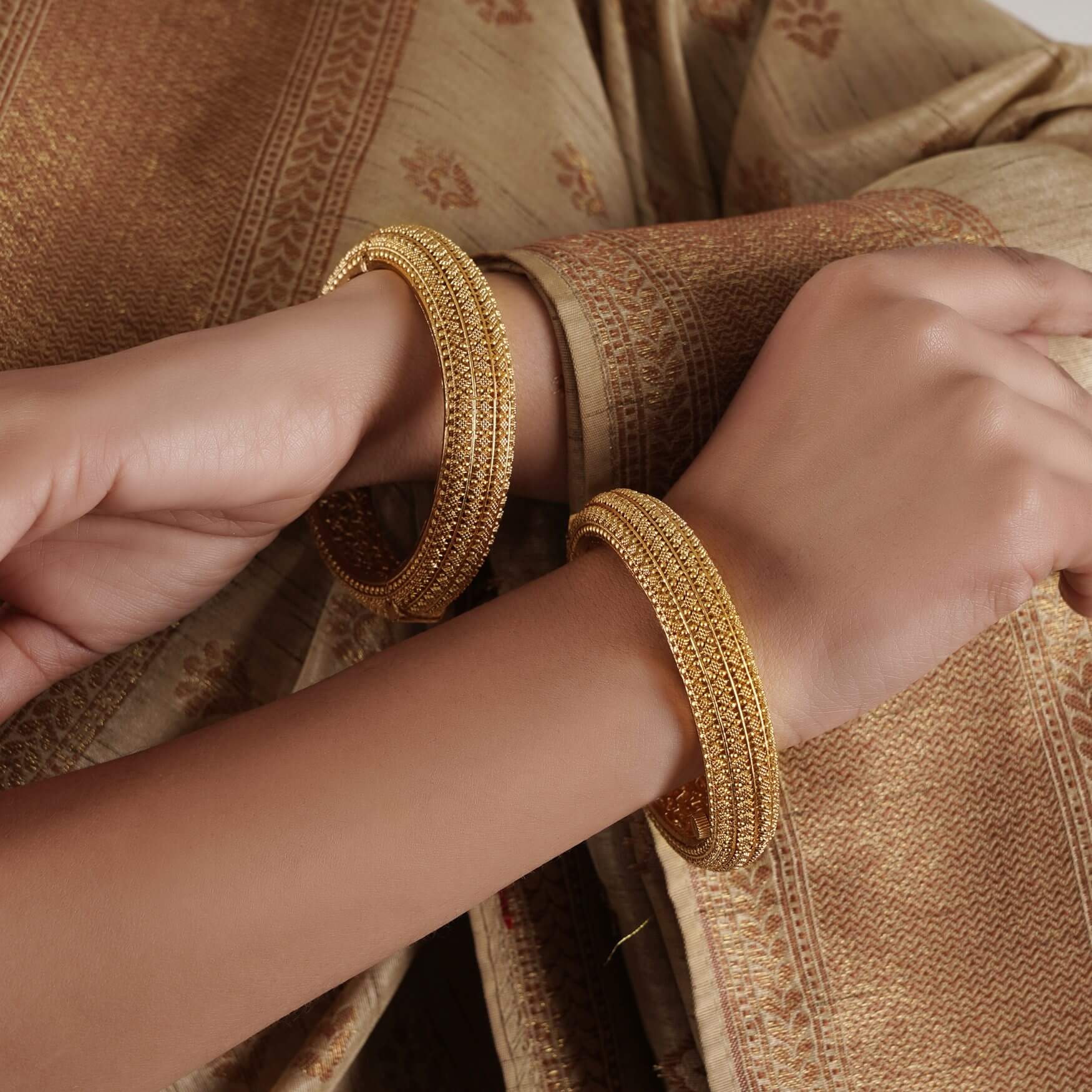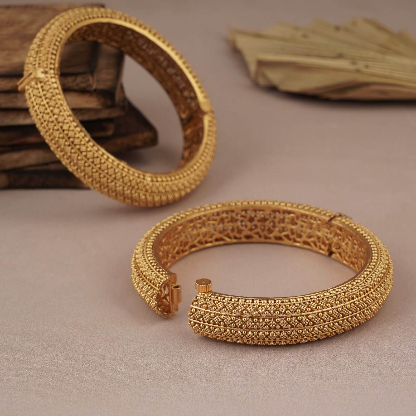 Gold plated broad openable bangle set is a timeless piece that will provide you with years of beautiful wear. The metal-brass alloy with gold plating is made to last. This Gold plated broad openable bangle set is show-stopping and comes in traditional Indian design with gold plating and handwork.   Buy Gold plated broad openable bangle set online and get free shipping even on Cash on Delivery