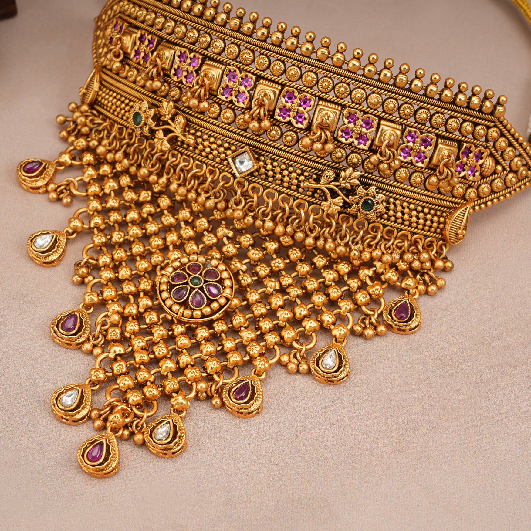 Gorgeous antique gold multicolor choker necklace set is a show-stopping, traditional Indian necklace set with gold plating and handwork.