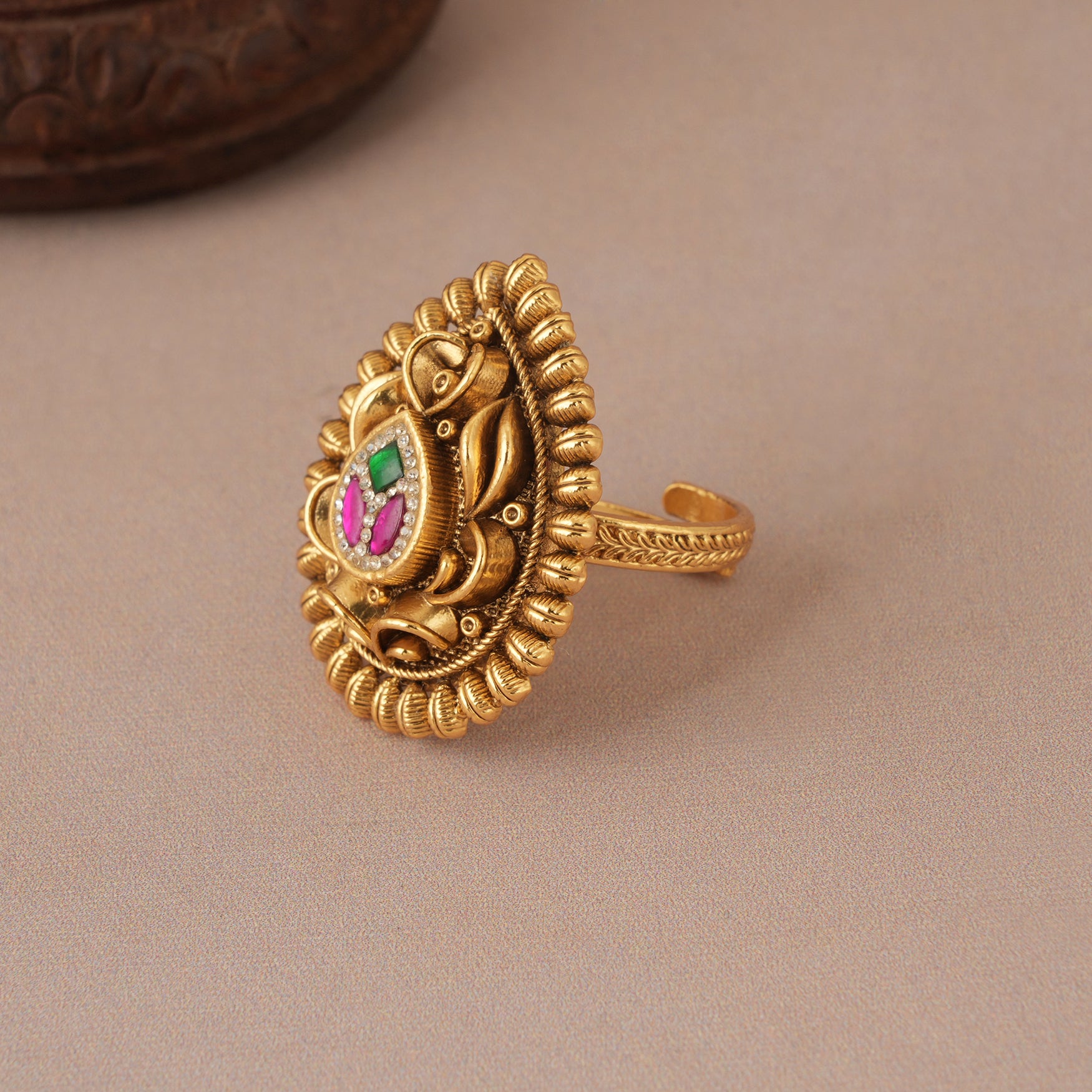 NOTE: This Gorgeous antique gold multicolor finger ring  been crafted by hand and Traditional beautiful antique gold finger ring have slight irregularities or imperfections in color or embellishment. These irregularities are the result of human involvement in the process and add to the finished product's charm while ensuring you have a one-of-a-kind piece.
