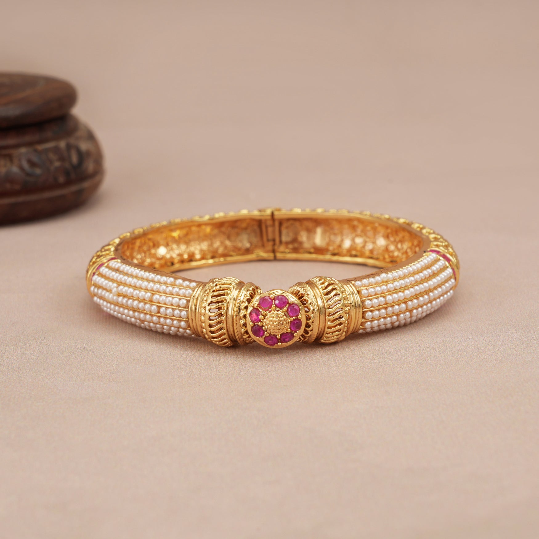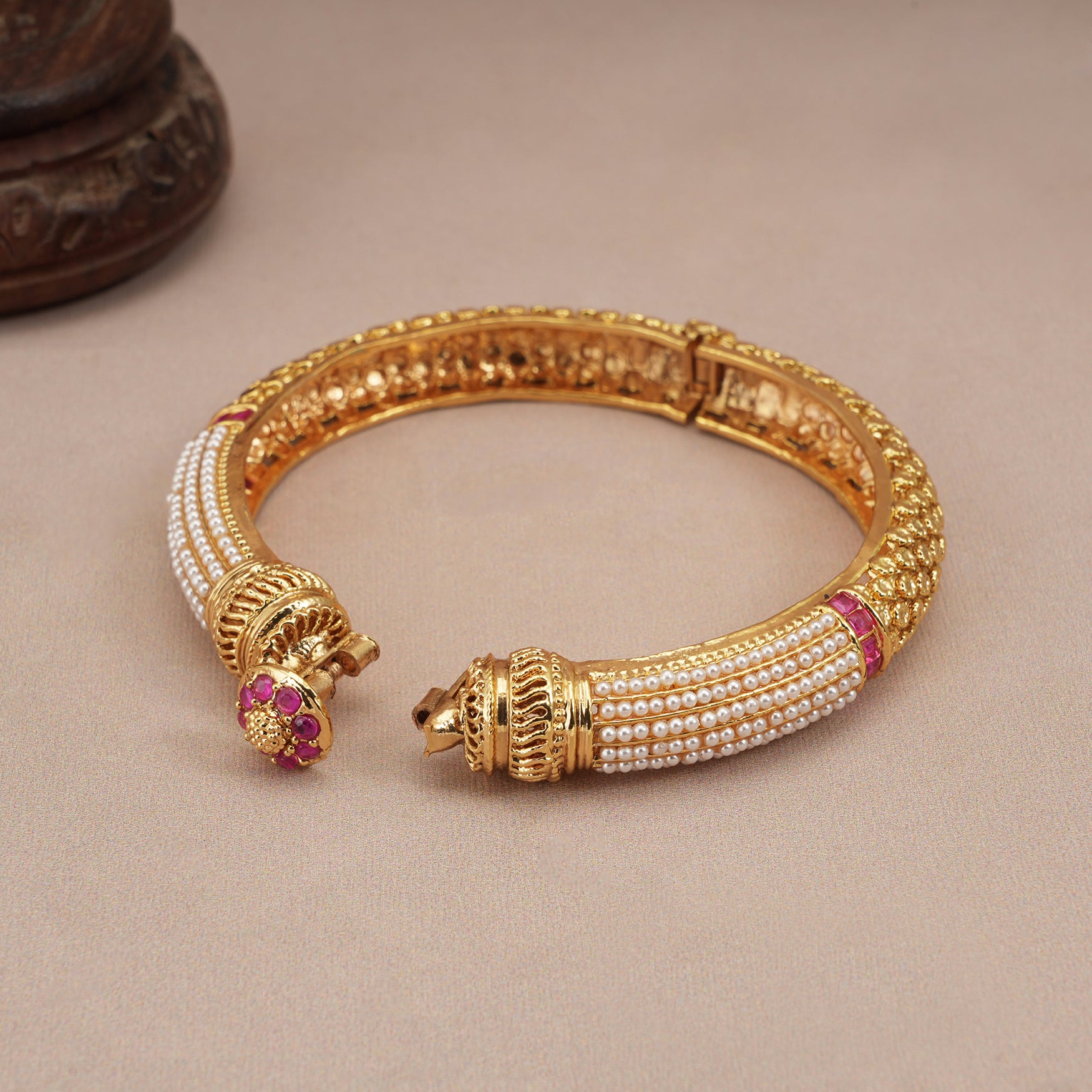NOTE: This Gorgeous gold plated pearl openable kada has been crafted by hand and may have slight irregularities or imperfections in color or embellishment. This kada comes in single piece only. These irregularities are the result of human involvement in the process and add to the finished product's charm while ensuring you have a one-of-a-kind piece.