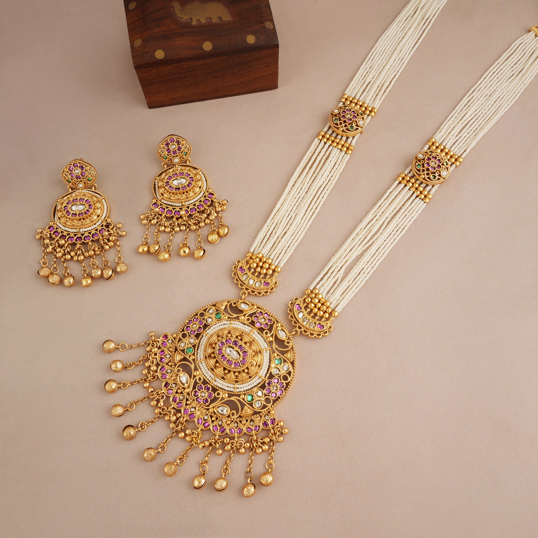 Long antique gold beautiful pearl stone necklace set for women  are show-stopping and come in traditional Indian design with gold plating and handwork.