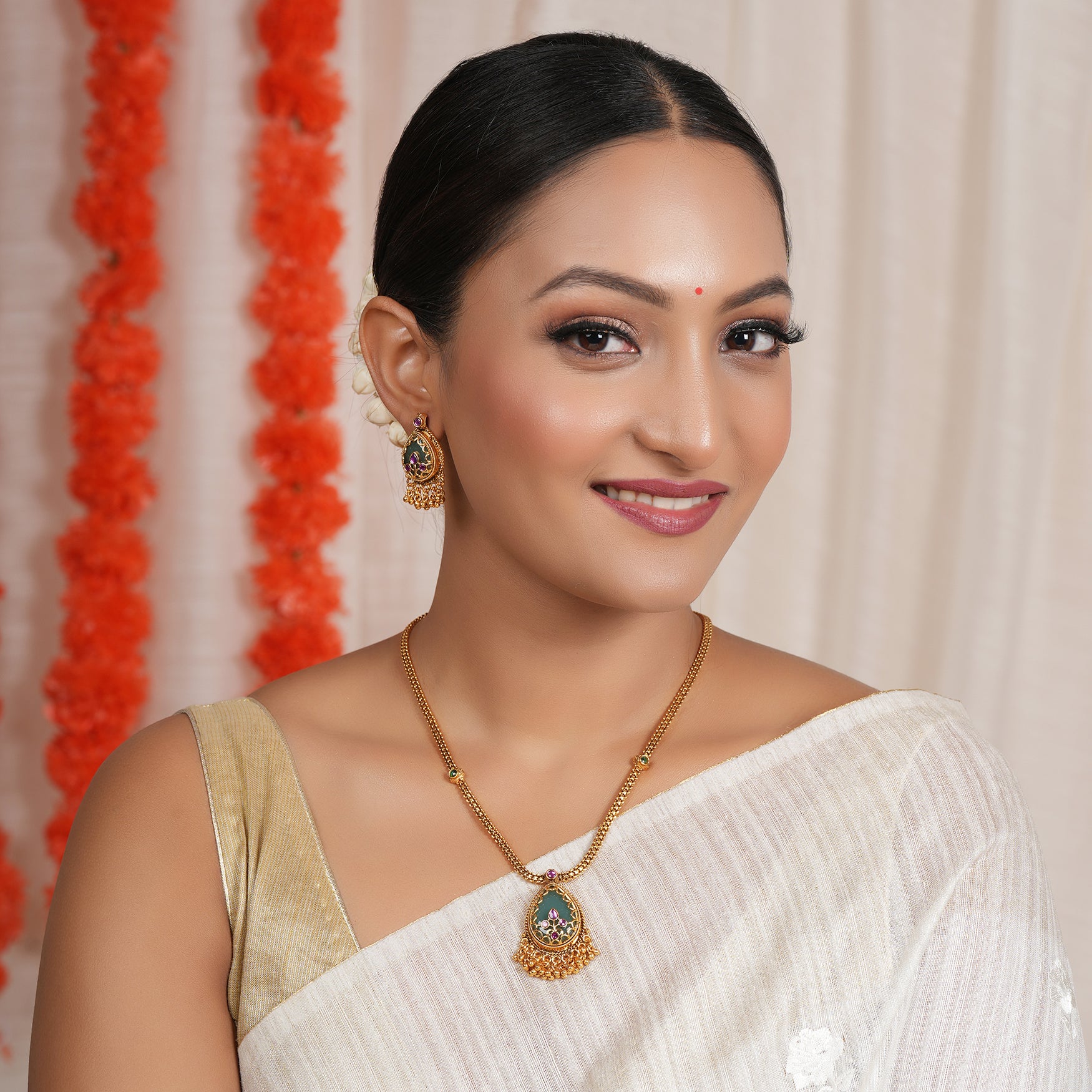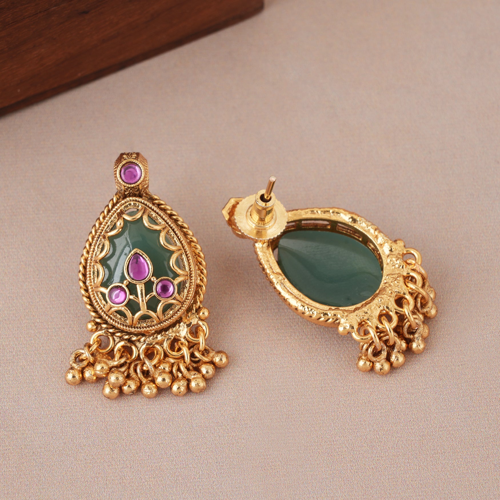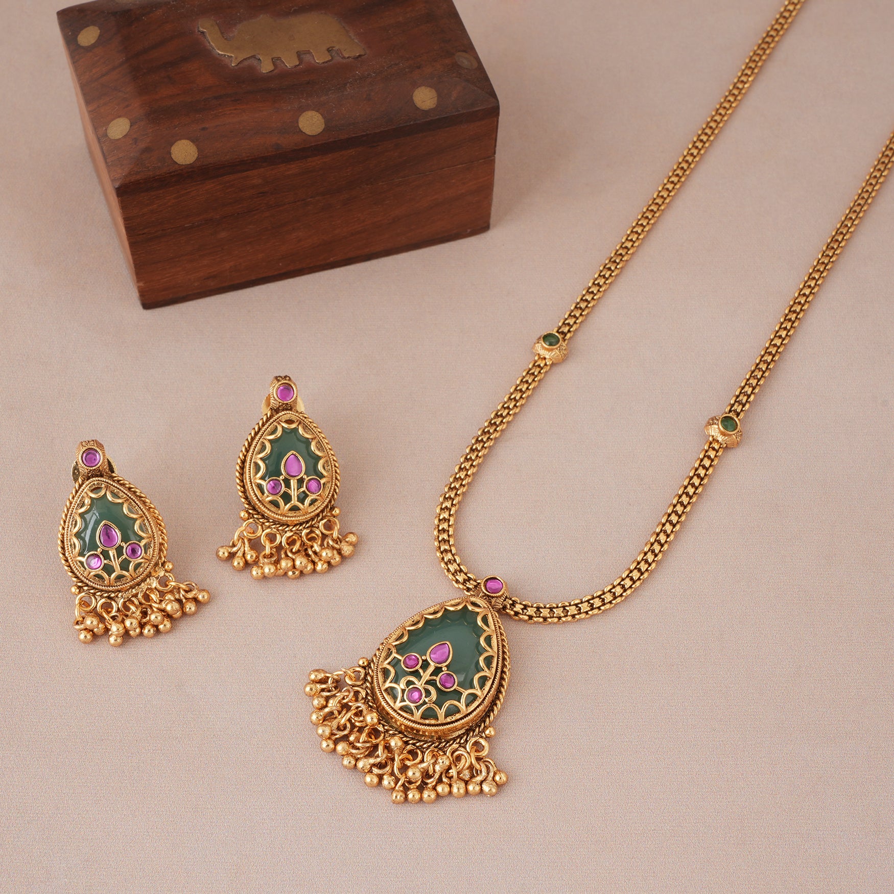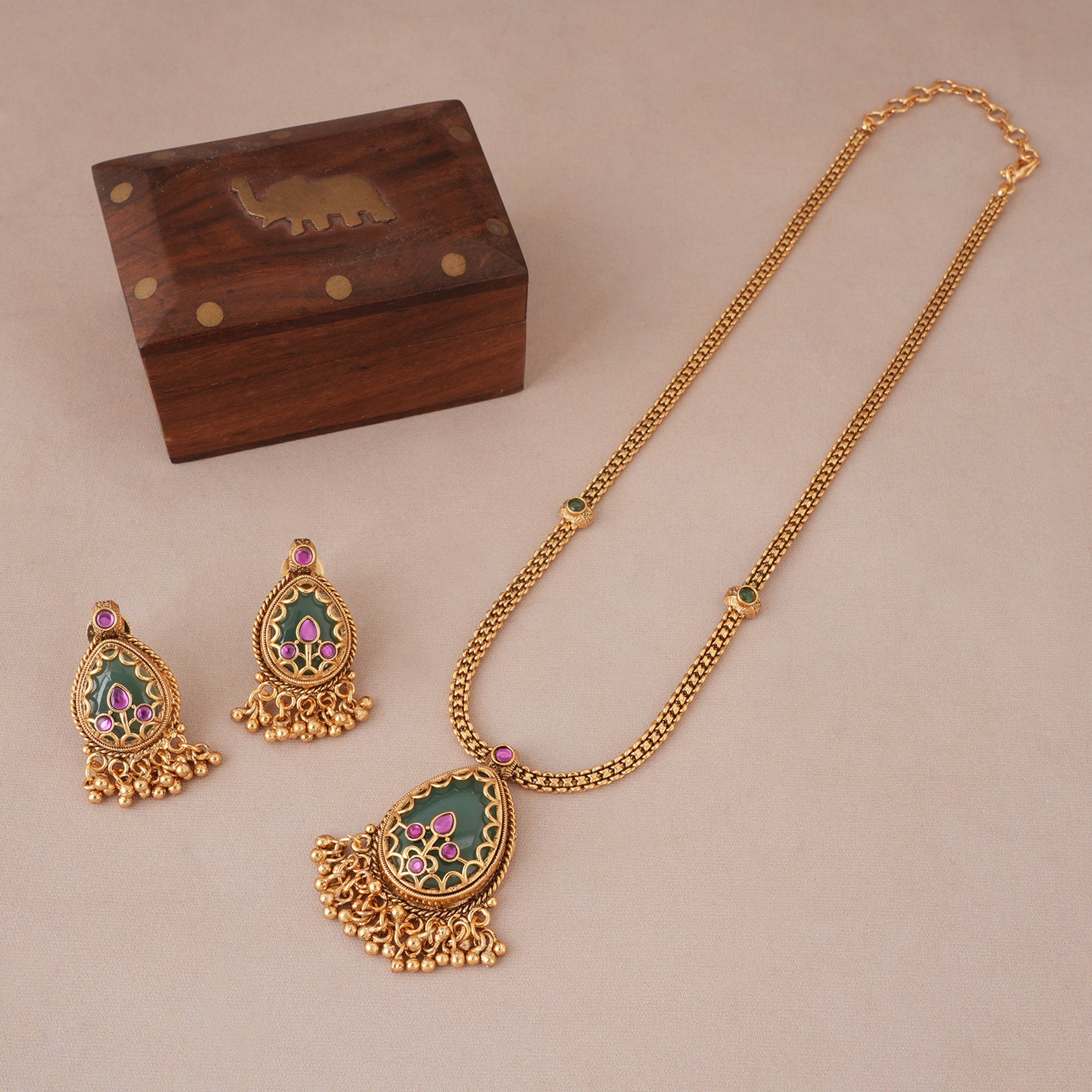 NOTE: This Long antique gold emerald stone pedant set  has been crafted by hand and may have slight irregularities or imperfections in color or embellishment. These irregularities are the result of human involvement in the process and add to the finished product's charm while ensuring you have a one-of-a-kind piece.