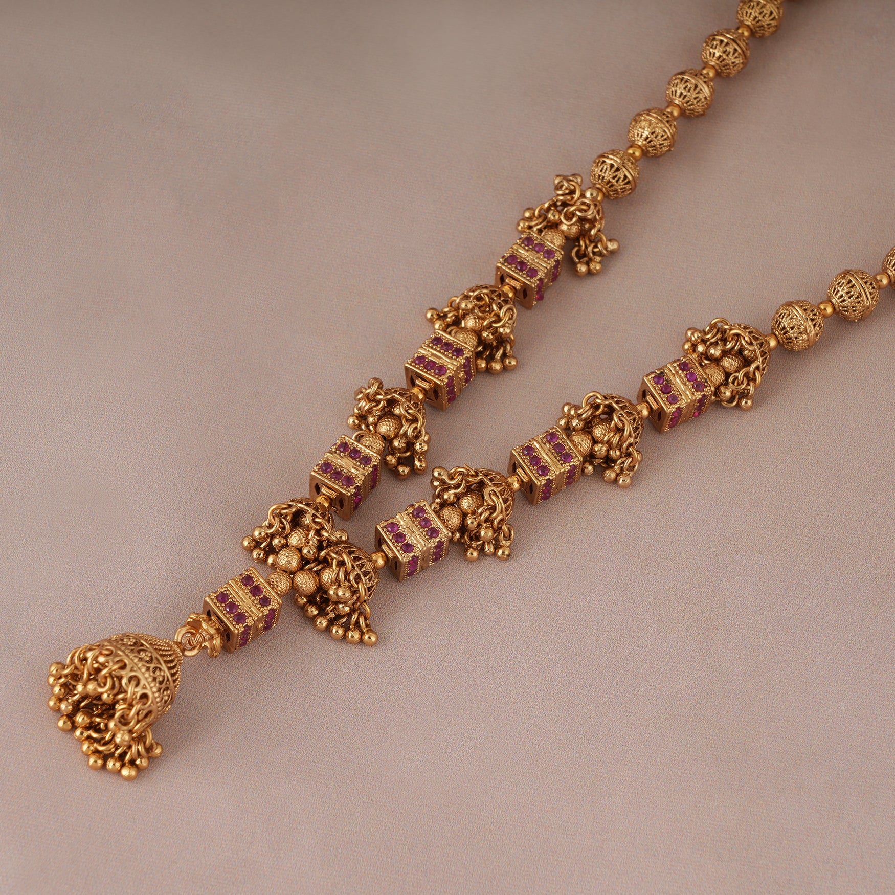NOTE: This Long antique gold jhumka fall necklace set with earring  is has been crafted by hand and may have slight irregularities or imperfections in colour or embellishment.