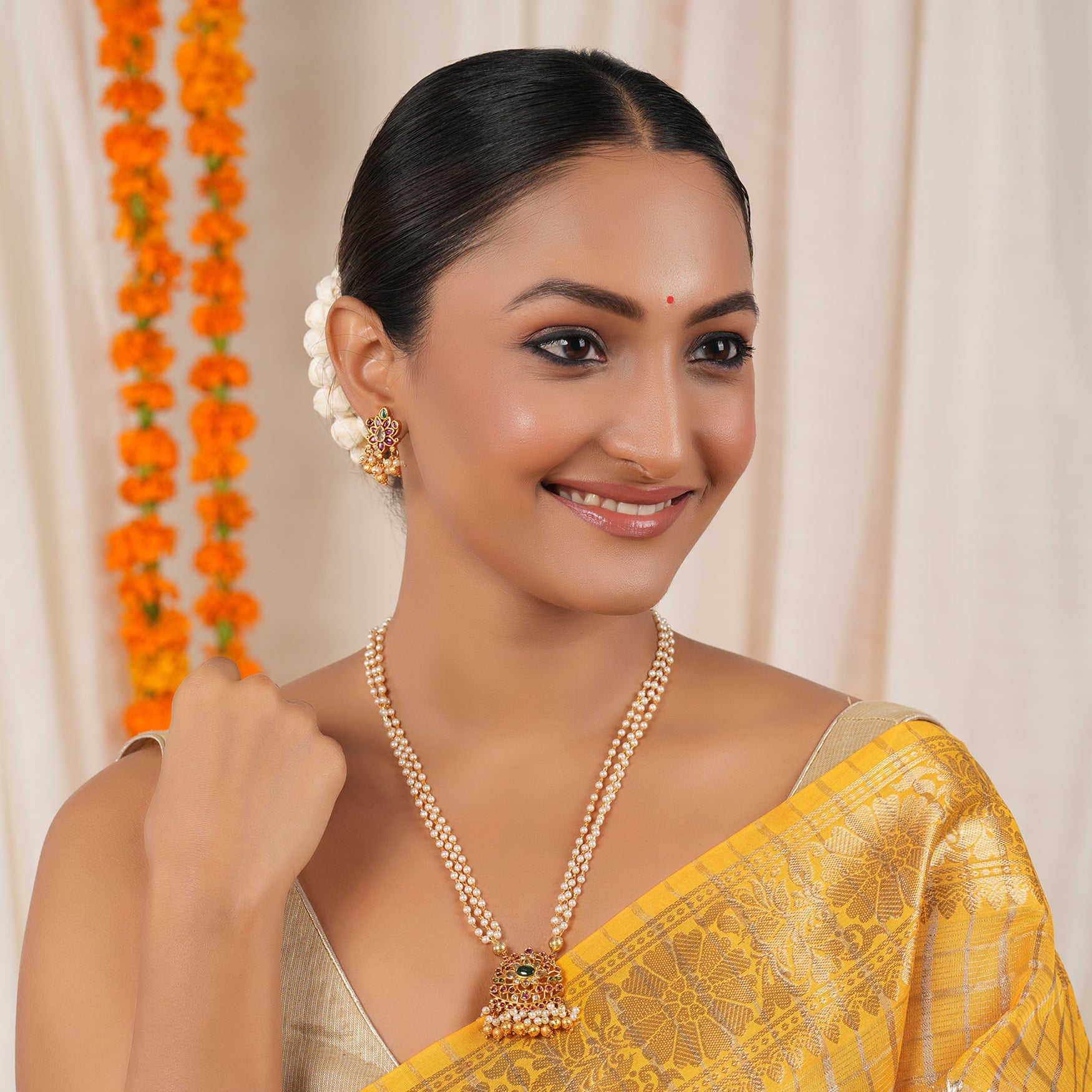 This set comes with beautiful pair of matching earrings Long antique gold pearl line stone pendant set is a show-stopping, traditional Indian necklace set with gold plating and handwork.