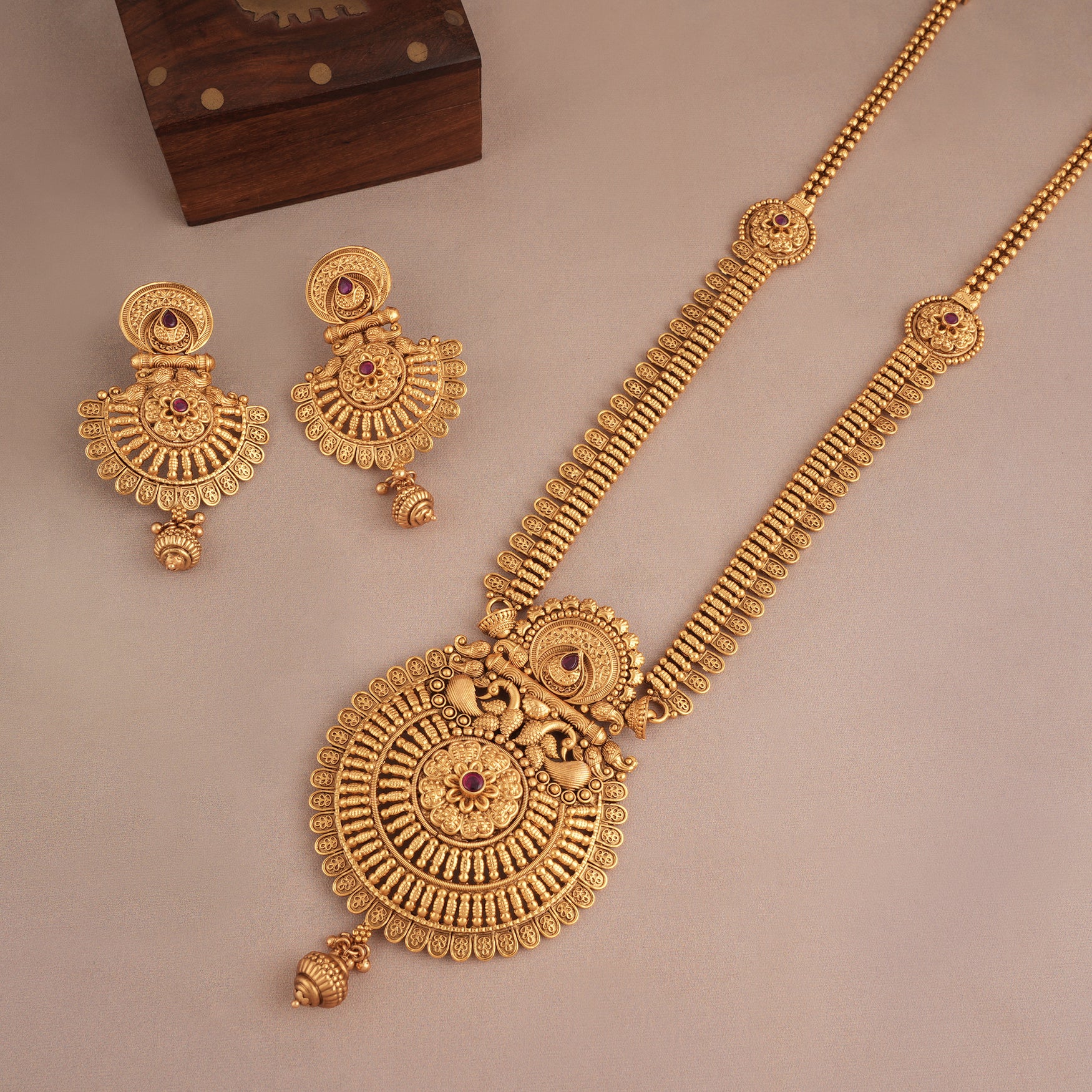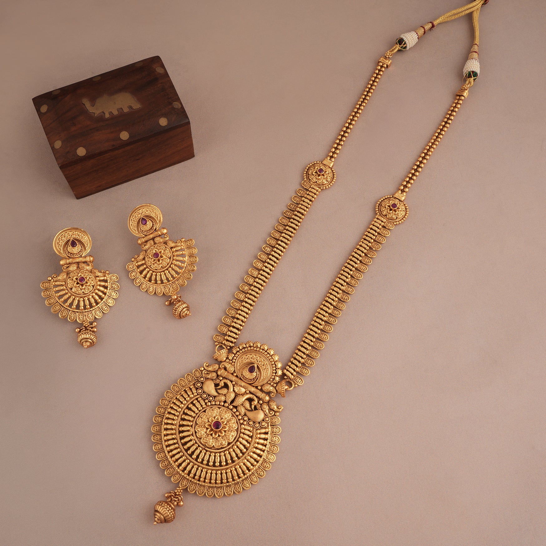 NOTE: Long antique gold plain stunning necklace set is has been crafted by hand and may have slight irregularities or imperfections in color or embellishment. These irregularities are the result of human involvement in the process and add to the finished product's charm while ensuring you have a one-of-a-kind piece.
