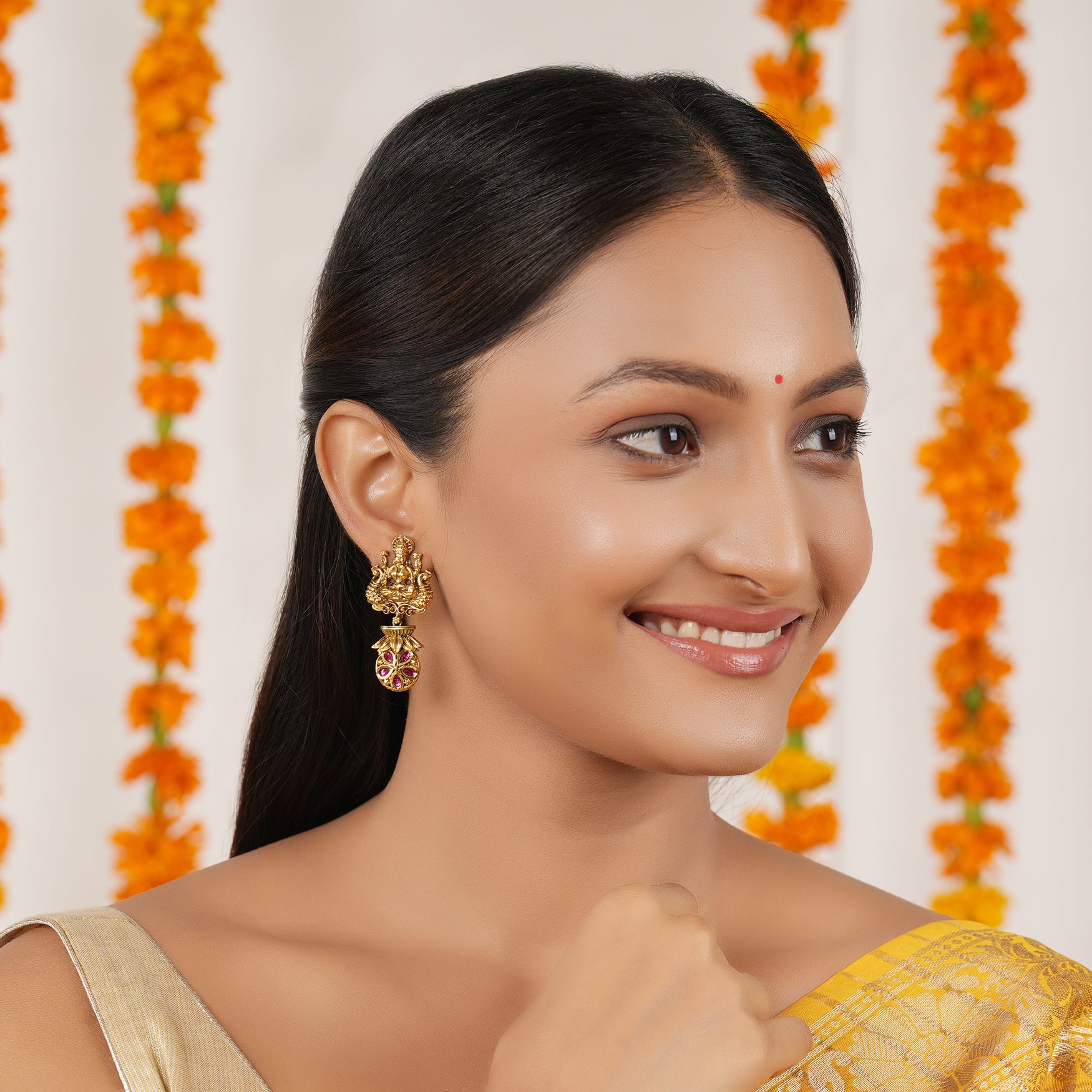 Long antique gold plated ma lakshmi ruby stone earring I Temple Jewellery are show-stopping and come in contemporary Indian design with gold plating and handwork. Long antique gold plated ma lakshmi ruby stone earring I Temple Jewellery and get free shipping even on Cash on Delivery.