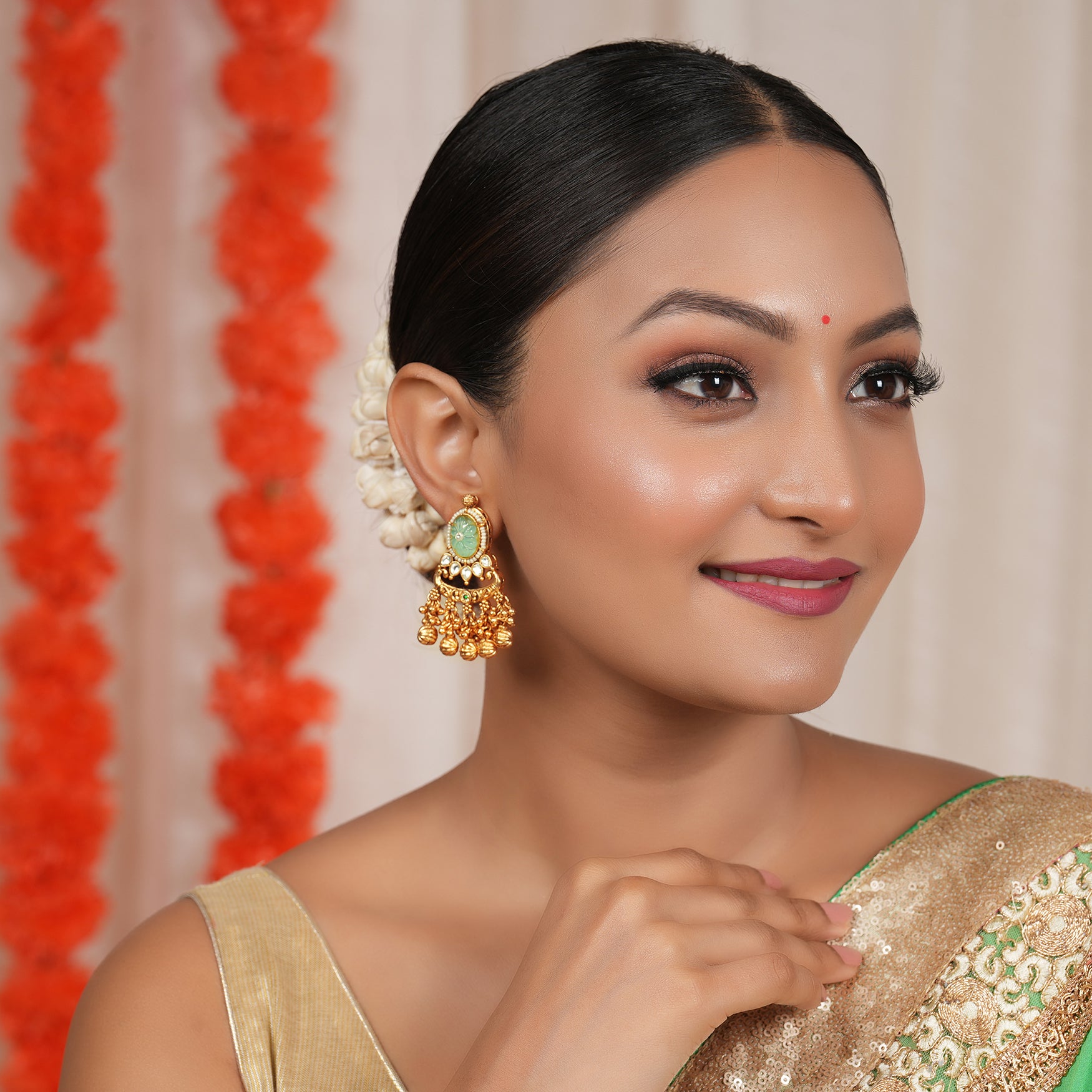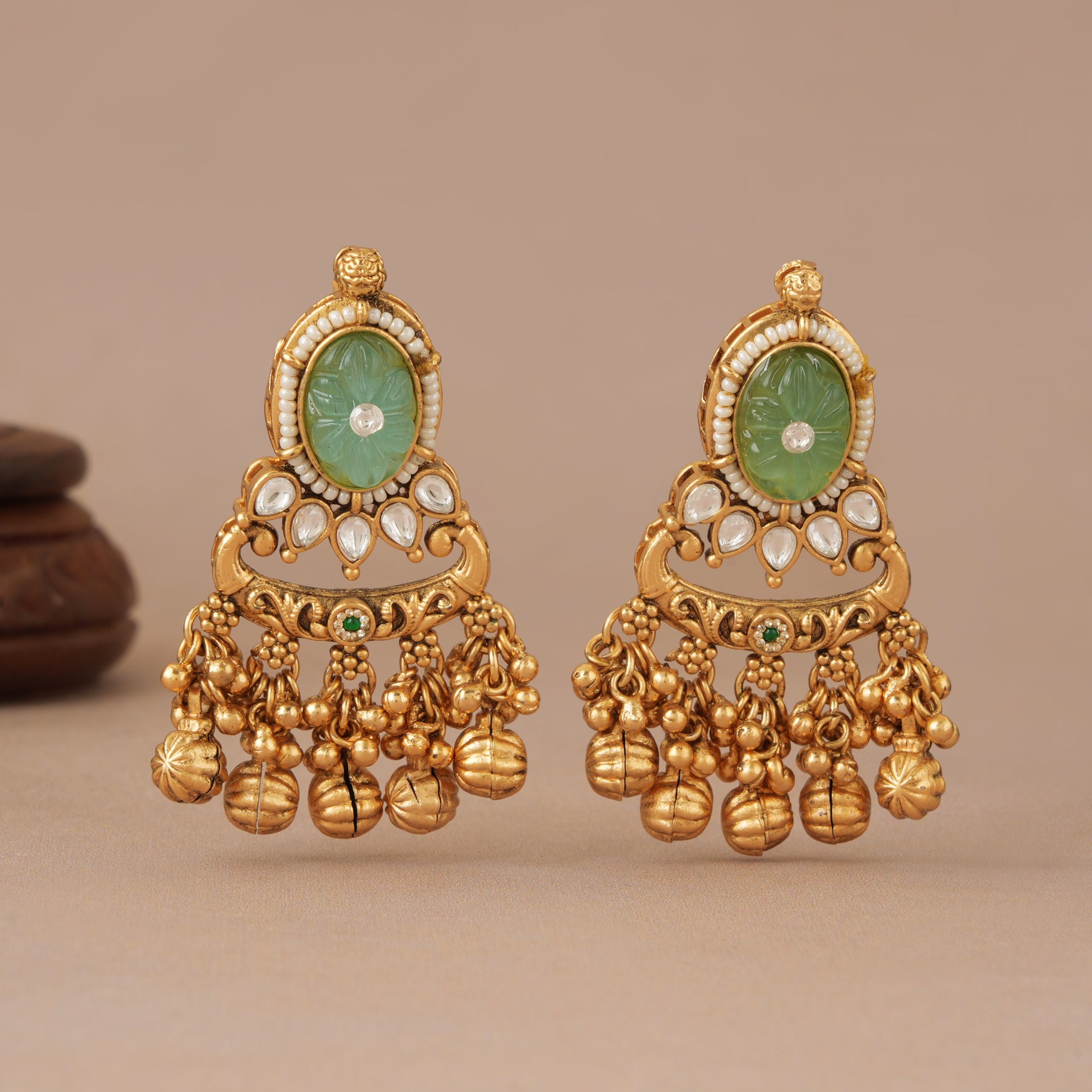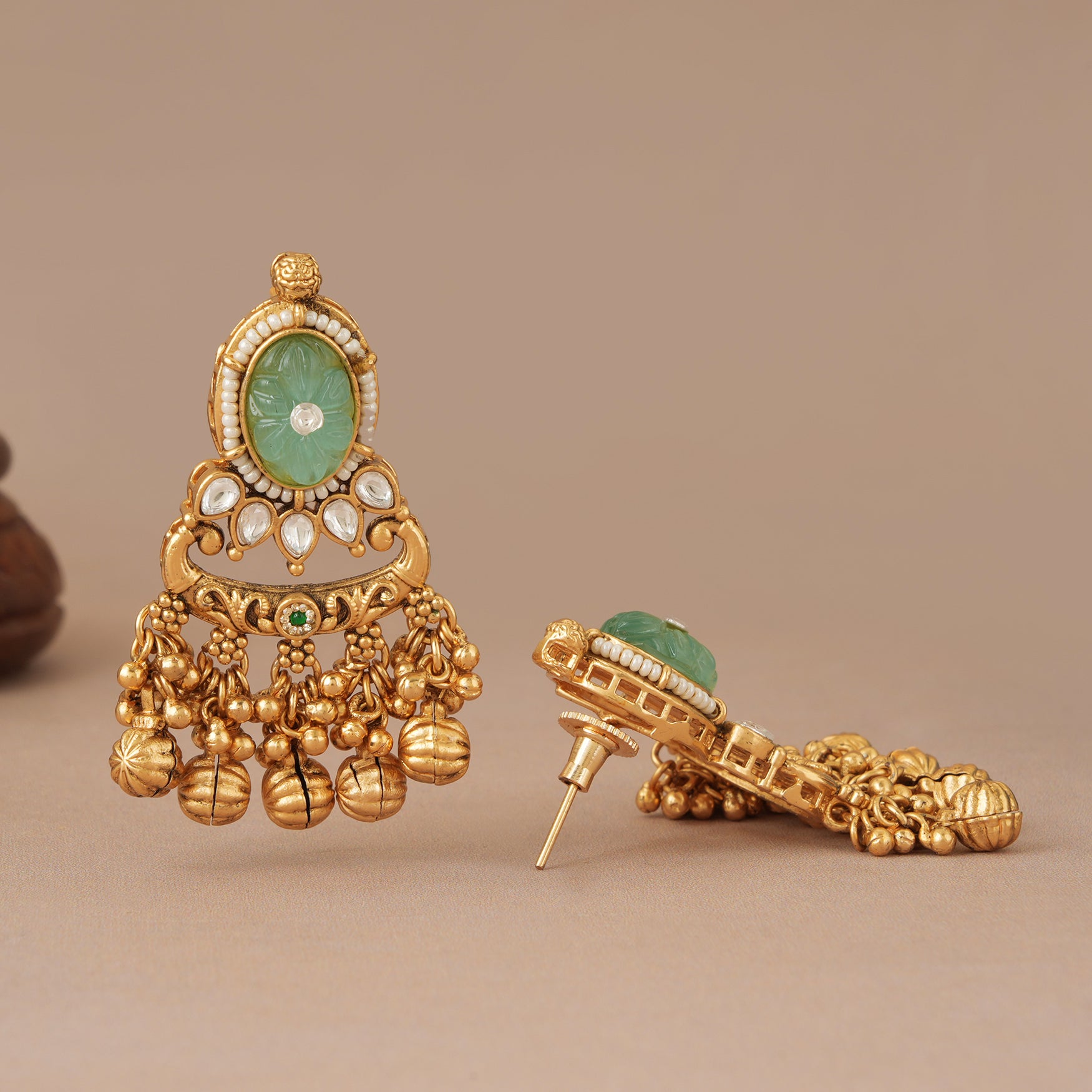 NOTE: These Long antique gold stone rajwadi kundan earring has been crafted by hand and may have slight irregularities or imperfections in colour or embellishment. These irregularities are the result of human involvement in the process and add to the finished product's charm while ensuring you have a one-of-a-kind piece.