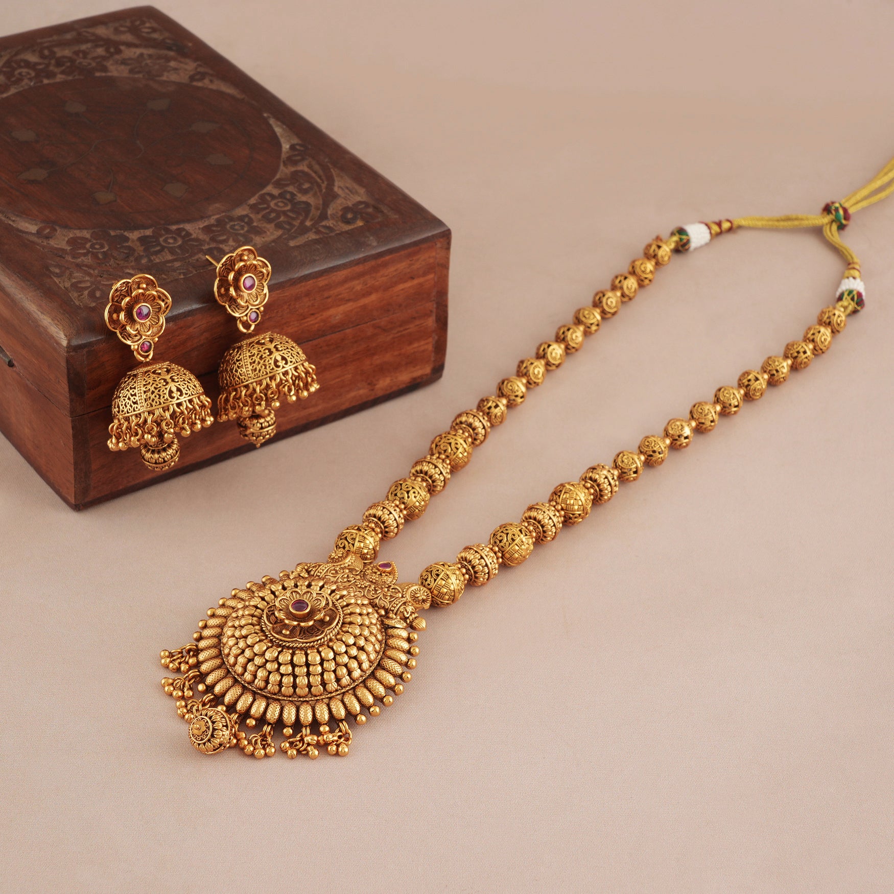 NOTE: Long antique gold traditional necklace set is has been crafted by hand and may have slight irregularities or imperfections in color or embellishment. These irregularities are the result of human involvement in the process and add to the finished product's charm while ensuring you have a one-of-a-kind piece.