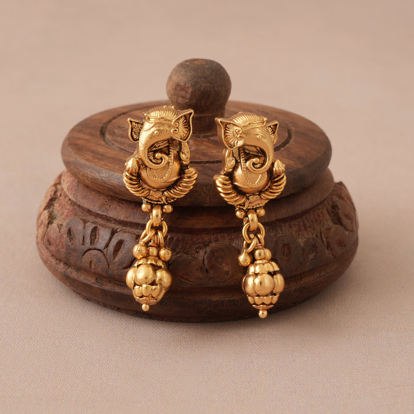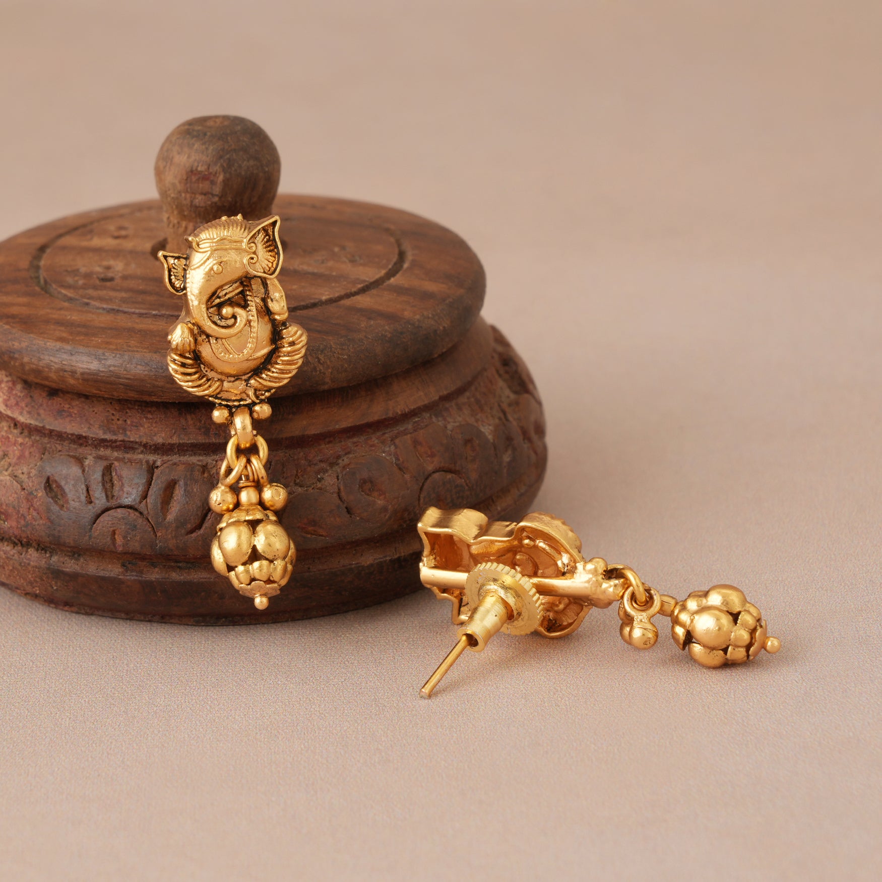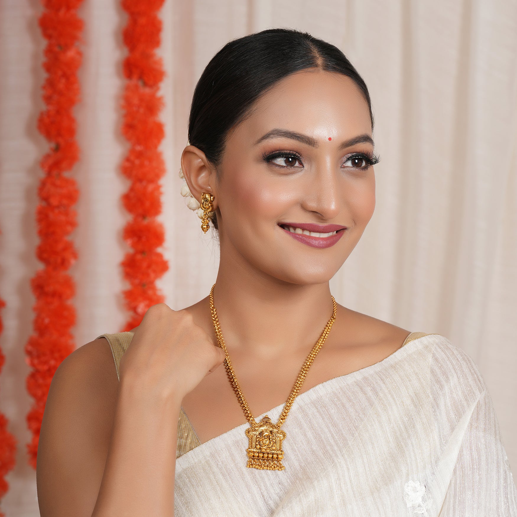 NOTE: This Long plain antique gold lord ganesh pendant set I Temple Jewellery has been crafted by hand and may have slight irregularities or imperfections in colour or embellishment. These irregularities are the result of human involvement in the process and add to the finished product's charm while ensuring you have a one-of-a-kind piece.