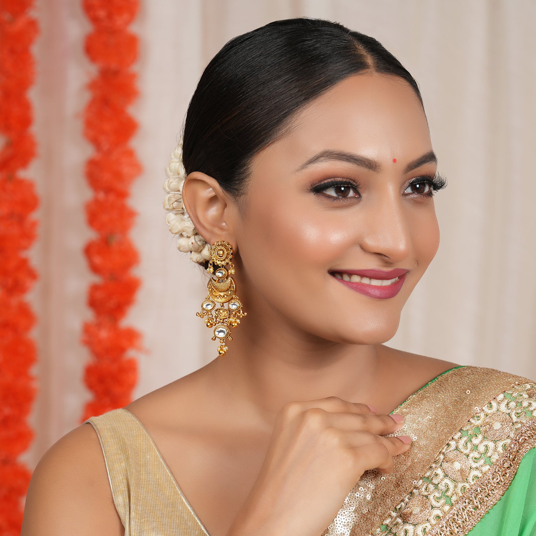 NOTE: These Long stunning antique gold kundan earring   have been crafted by hand and may have slight irregularities or imperfections in color or embellishment. These irregularities are the result of human involvement in the process and add to the finished product's charm while ensuring you have a one-of-a-kind piece.