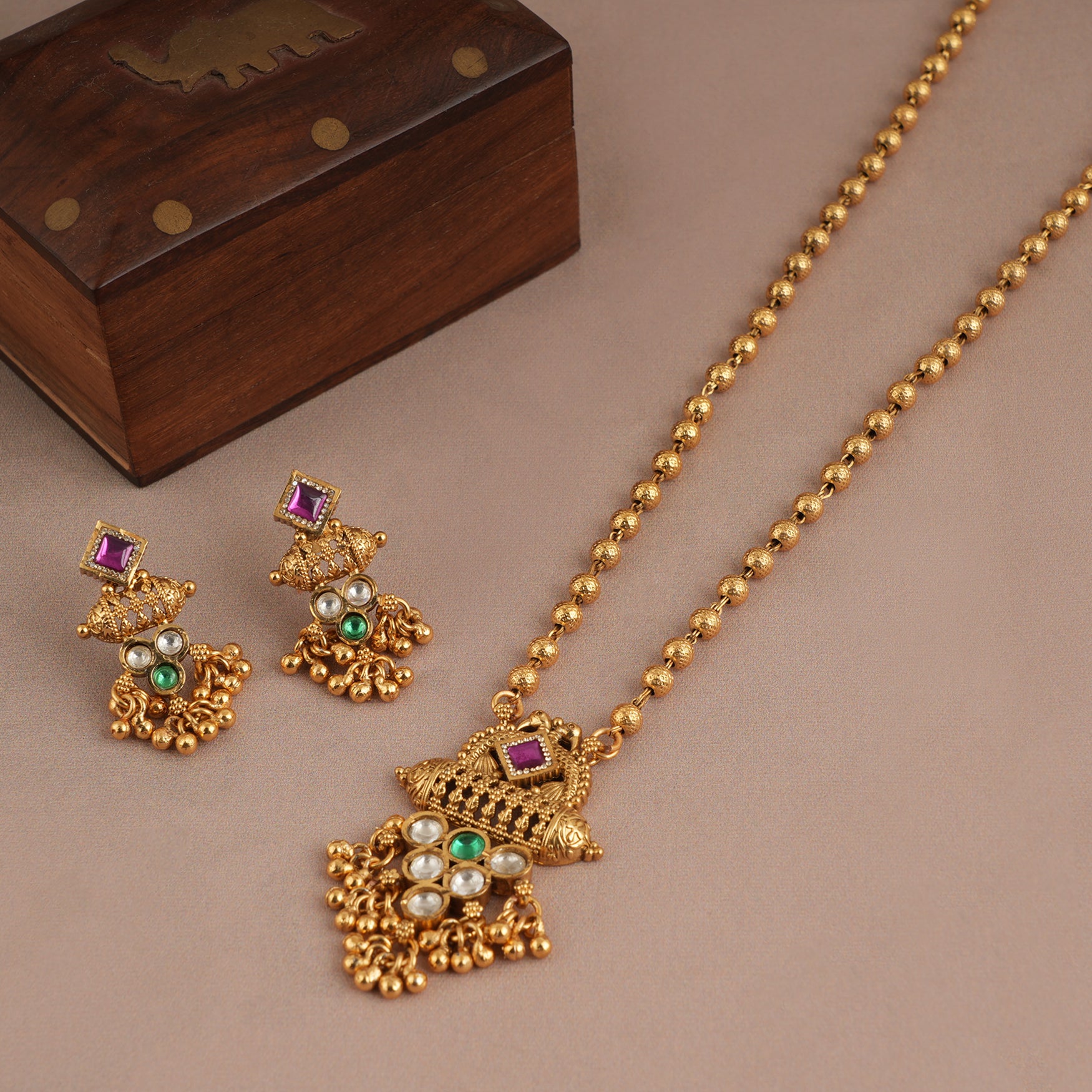NOTE: This Long stunning antique gold stone pendant set  has been crafted by hand and may have slight irregularities or imperfections in color or embellishment. These irregularities are the result of human involvement in the process and add to the finished product's charm while ensuring you have a one-of-a-kind piece.