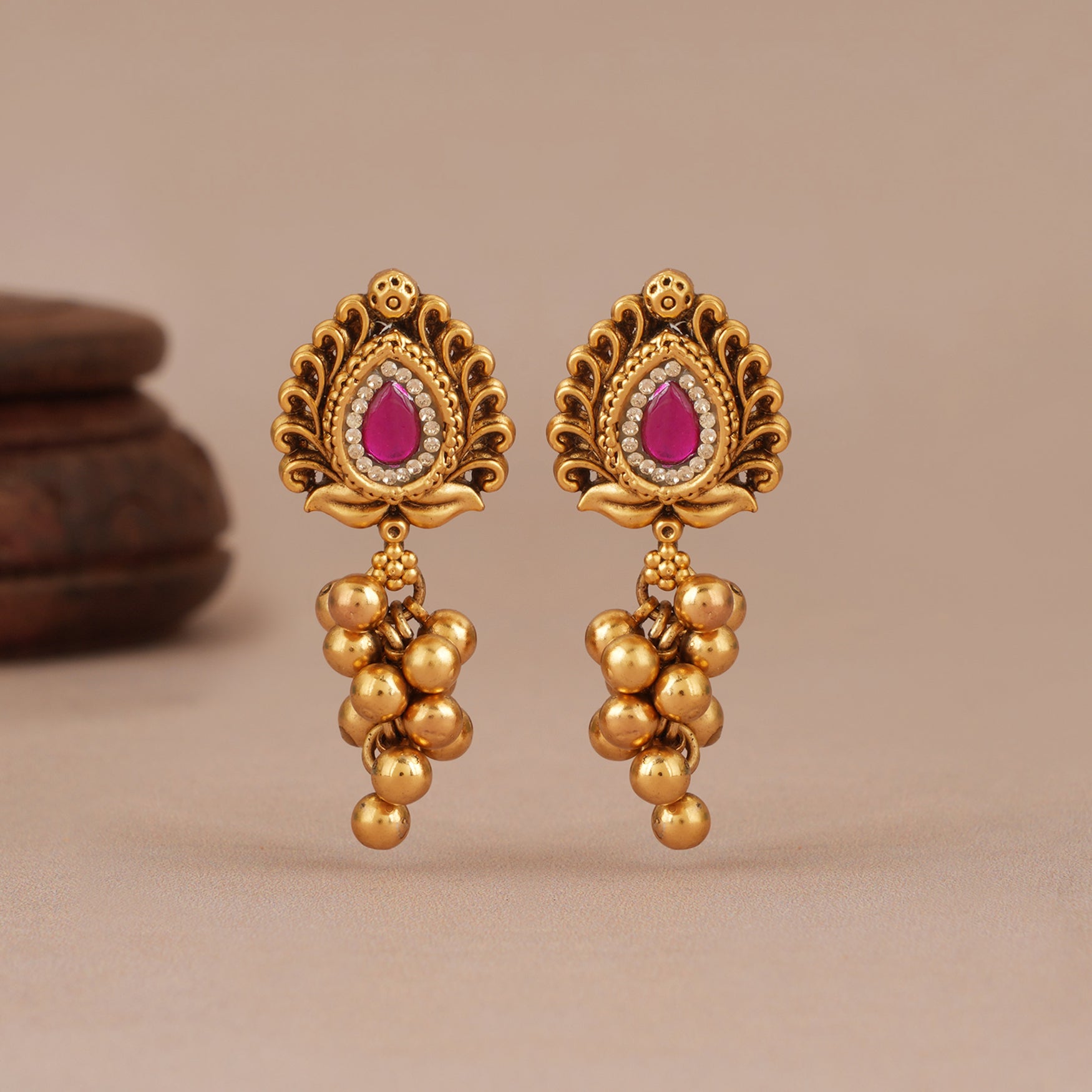 long Stunning stone antique gold ruby earring of brass alloy with gold plating. These earrings are 1.4 inches long, and the lock is push back.  long Stunning stone antique gold ruby earring    how-stopping and come in traditional  Indian   design with gold plating and handwork.