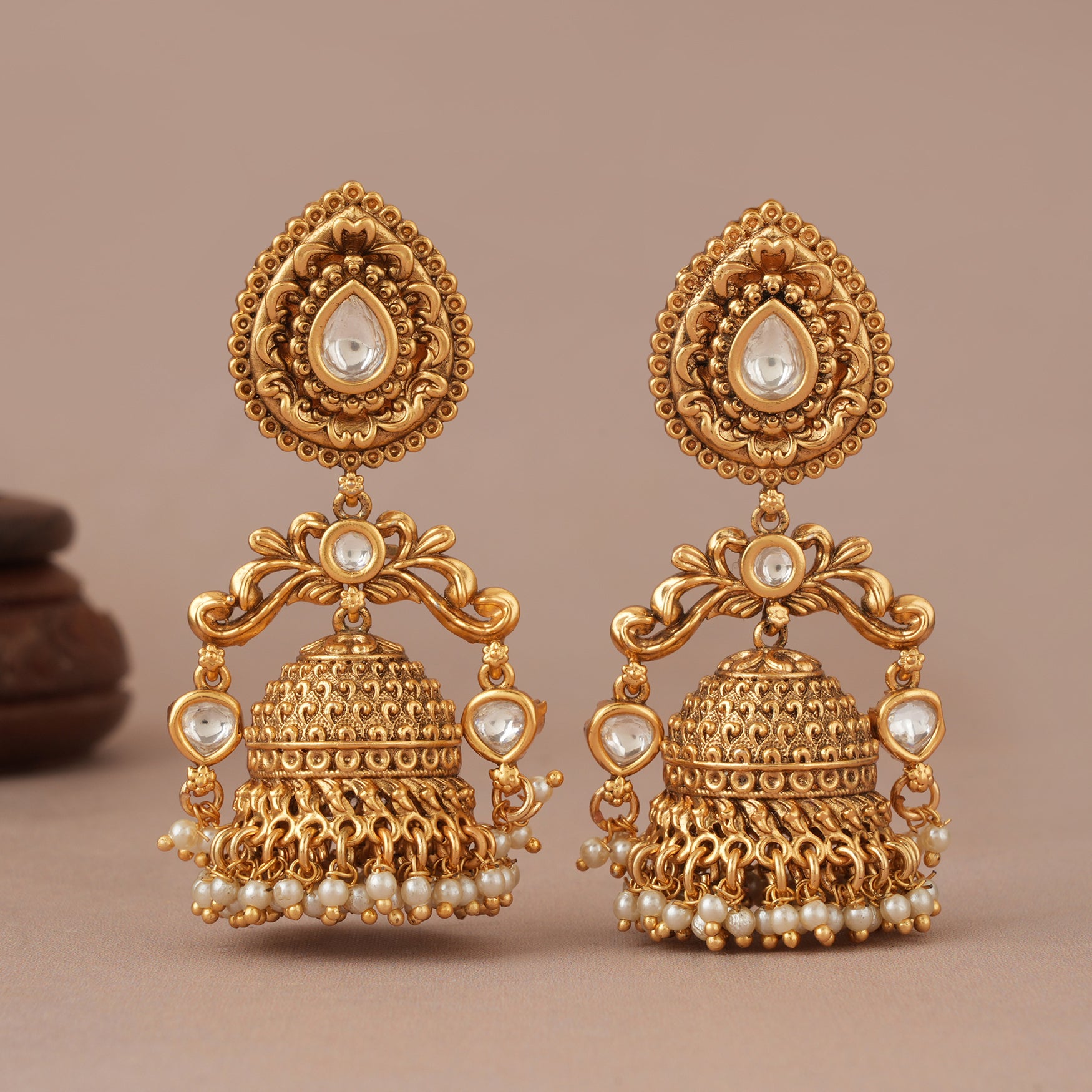 Long traditional antique gold pearl drop jhumka earring