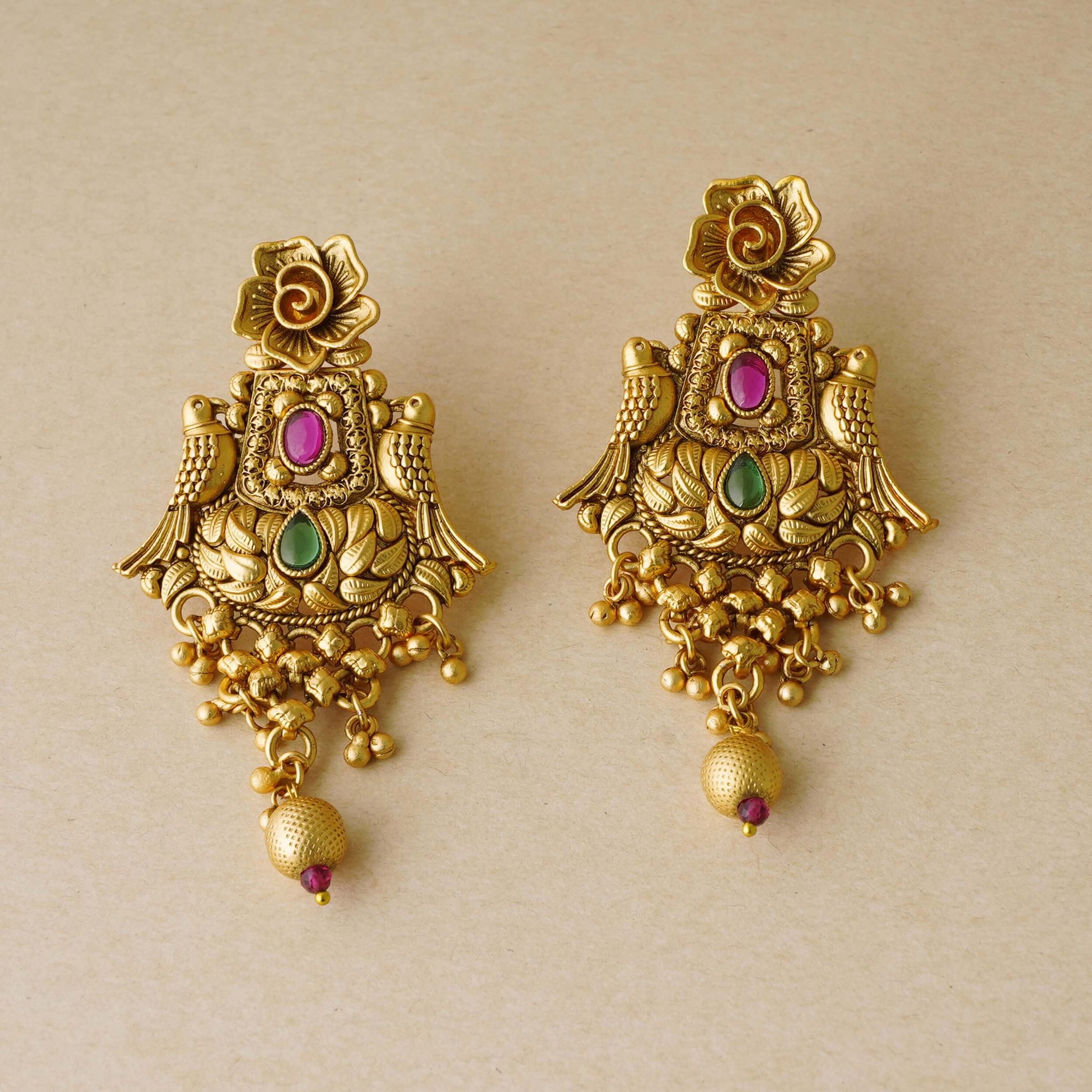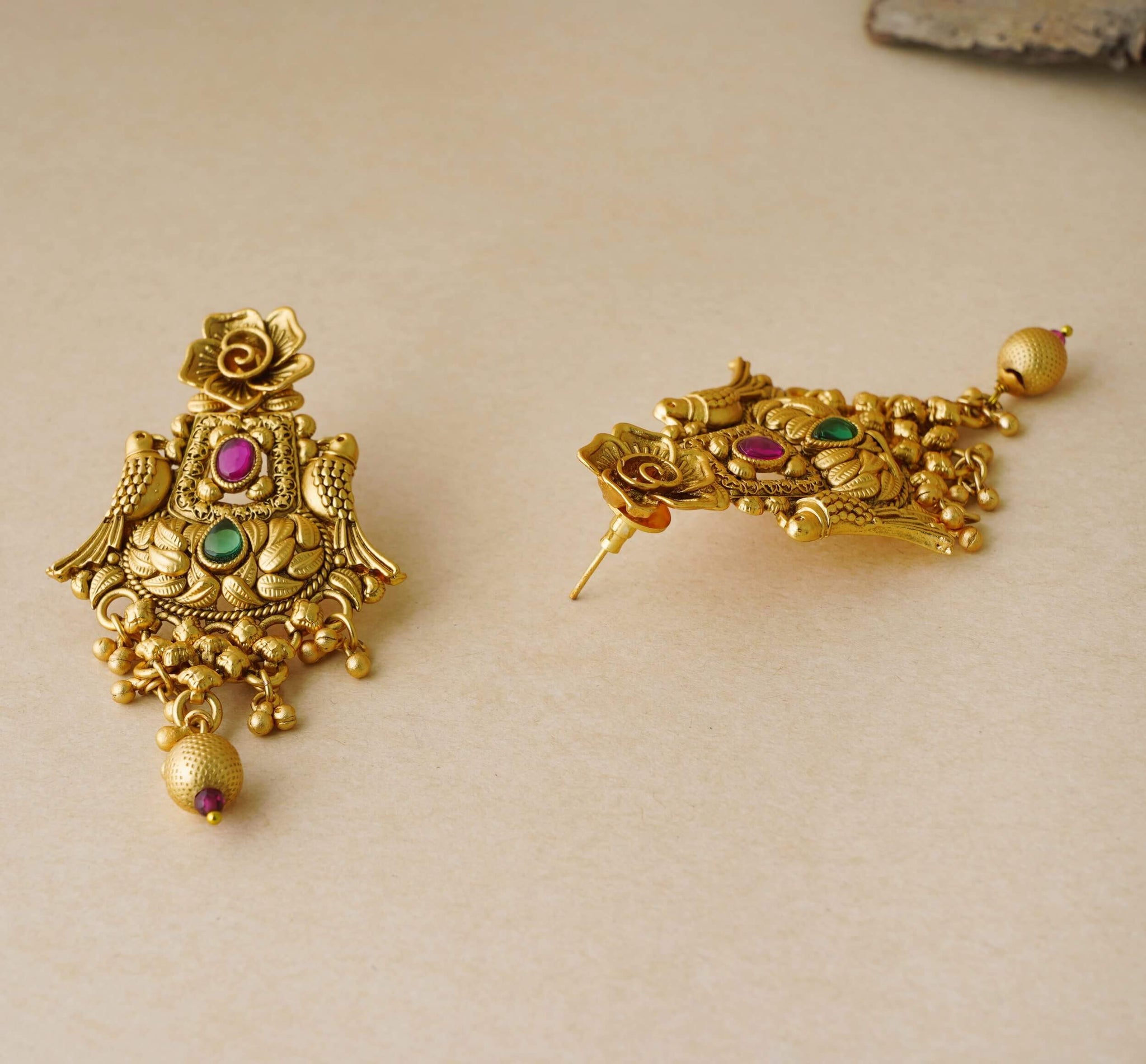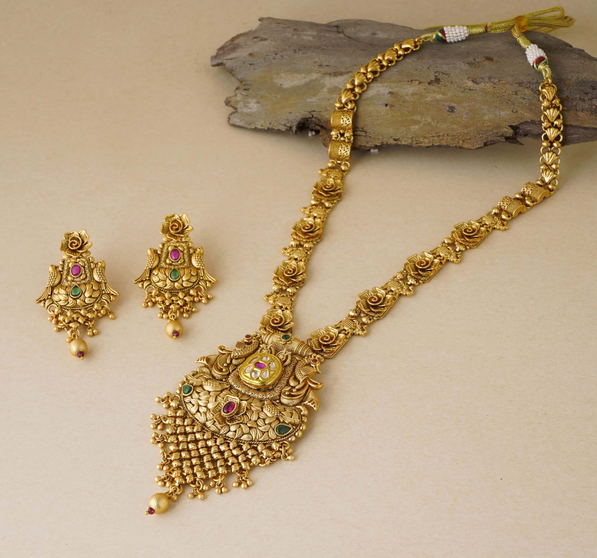NOTE: This Matt finish floral gold long necklace set has been crafted by hand and may have slight irregularities or imperfections in color or embellishment. These irregularities are the result of human involvement in the process and add to the finished product's charm while ensuring you have a one-of-a-kind piece.