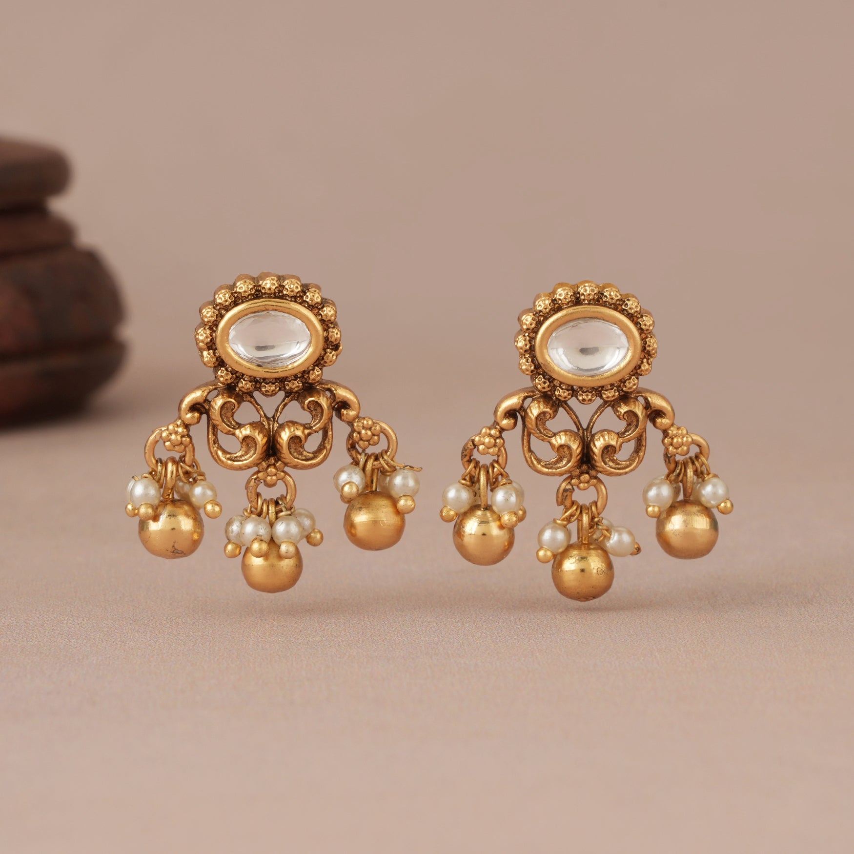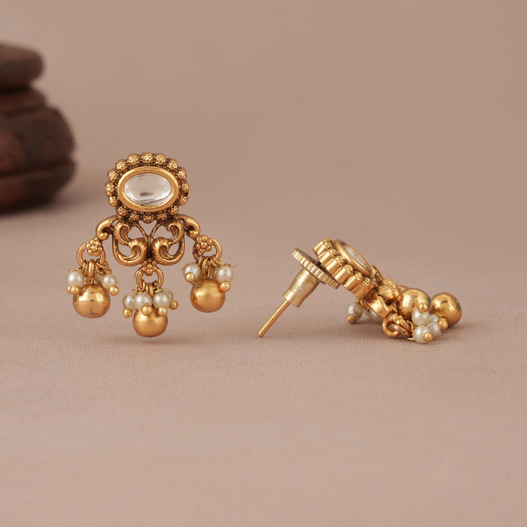 NOTE: These Pearl drop kundan antique gold earring      been crafted by hand and may have slight irregularities or imperfections in colour or embellishment. These irregularities are the result of human involvement in the process and add to the finished product's charm while ensuring you have a one-of-a-kind piece.
