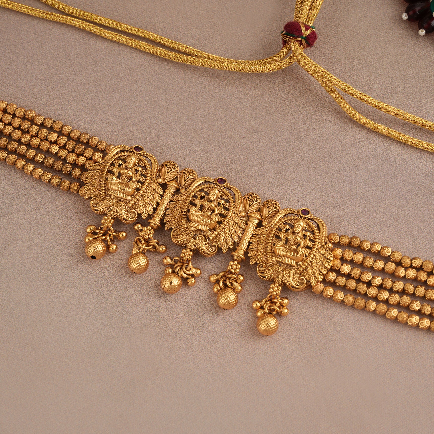 Plain Antique gold beautiful ma lakshmi choker necklace set I Temple Jewellery is made of brass alloy with gold plating. The necklace length is 16 inches and the necklace lock is drawing string. The earrings are 2.0 inches long, and its lock is a push-back.