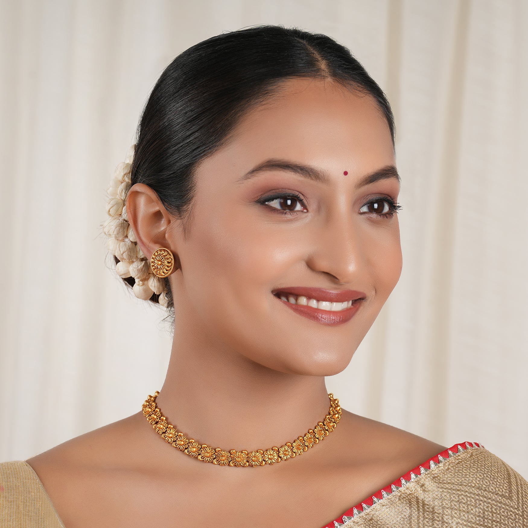NOTE: This Plain antique gold floral necklace set with earring   is has been crafted by hand and may have slight irregularities or imperfections in colour or embellishment. These irregularities are the result of human involvement in the process and add to the finished product's charm while ensuring you have a one-of-a-kind piece.