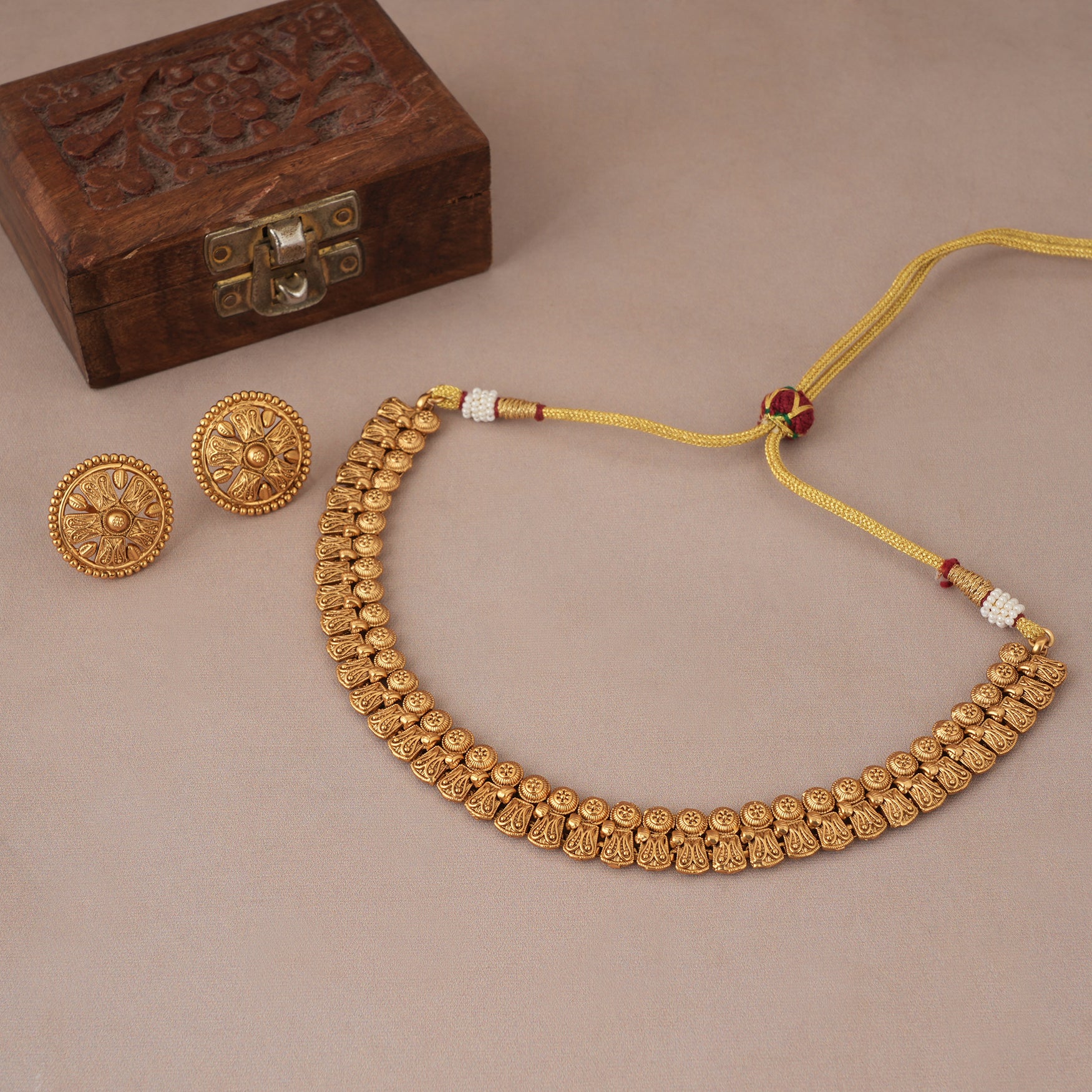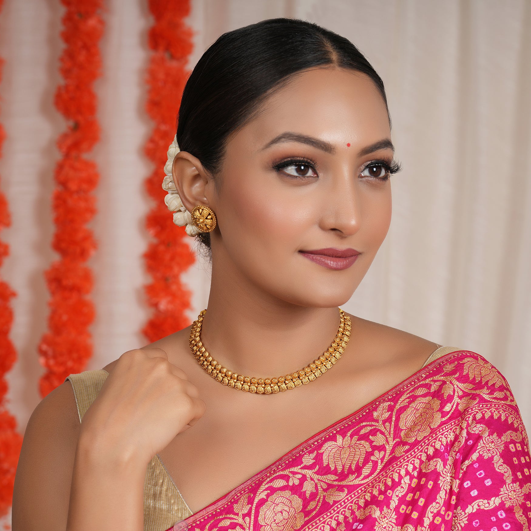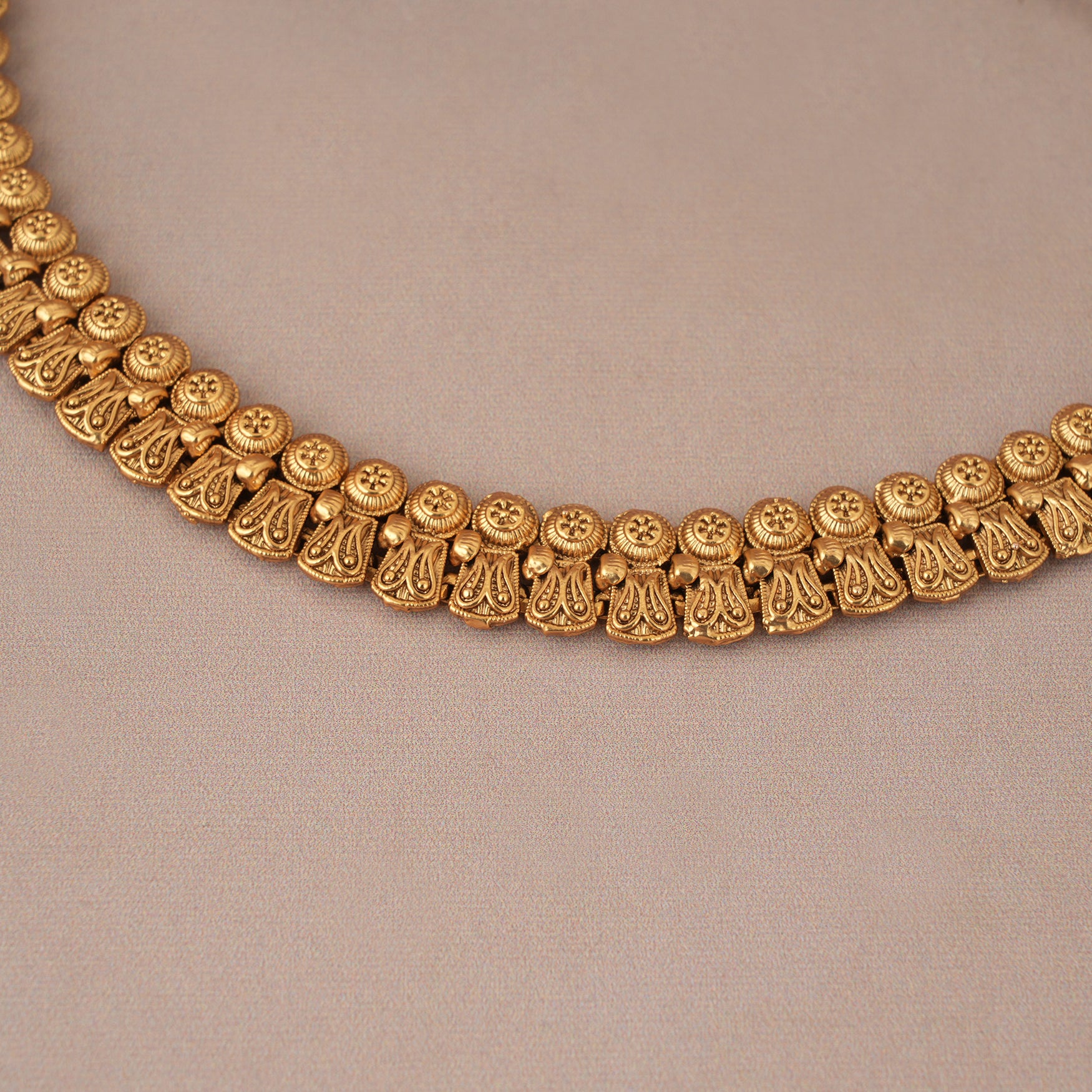 NOTE: These Plain traditional antique gold necklace set have been crafted by hand and may have slight irregularities or imperfections in color or embellishment. These irregularities are the result of human involvement in the process and add to the finished product's charm while ensuring you have a one-of-a-kind piece.