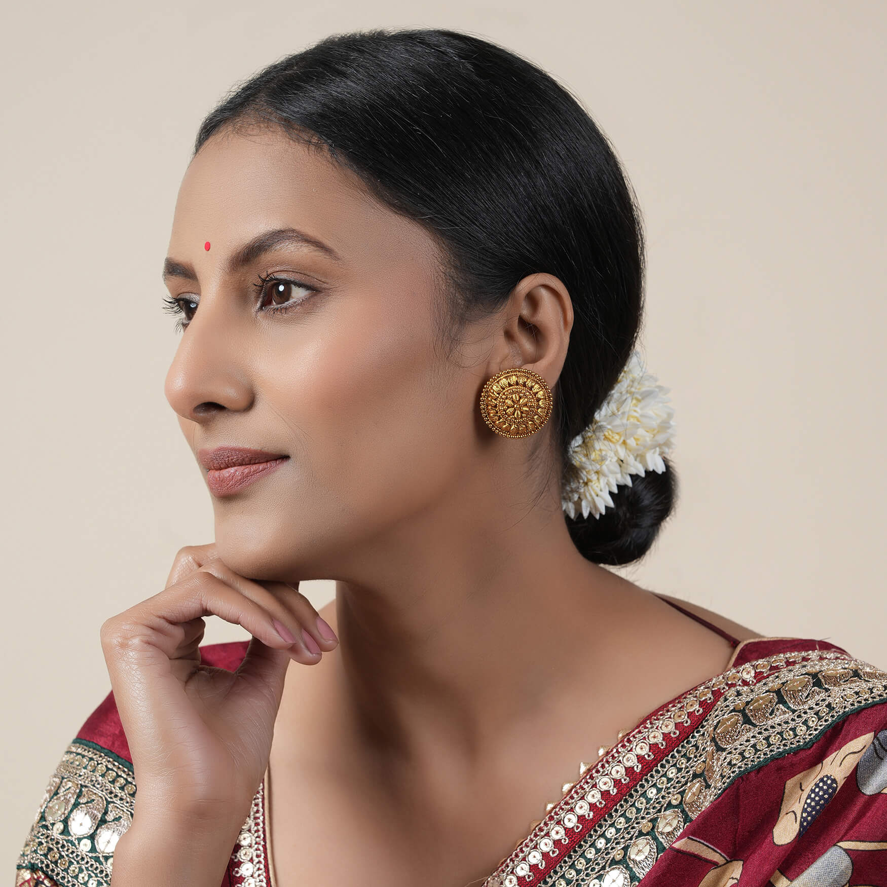 Round antique gold plated plain stud earring for women is made of brass alloy with gold plating. These studs are 1 inch long, and the lock is push back. Round antique gold plated plain stud earring are show-stopping and come in traditional Indian design with gold plating and handwork.   Round antique gold plated plain stud earring and get free shipping even on Cash on Delivery.