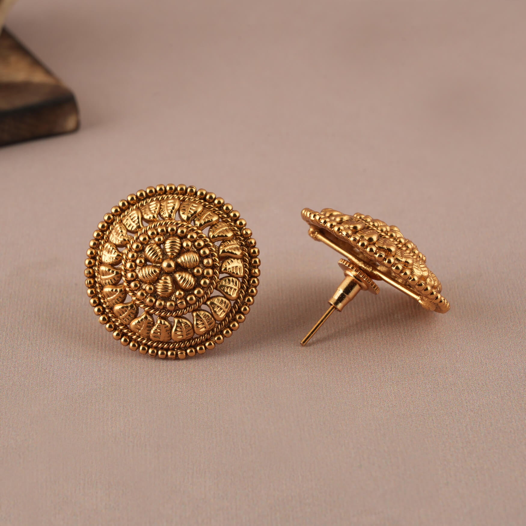 NOTE: These Round antique gold plated plain stud earring have been crafted by hand and may have slight irregularities or imperfections in color or embellishment. These irregularities are the result of human involvement in the process and add to the finished product's charm while ensuring you have a one-of-a-kind piece.
