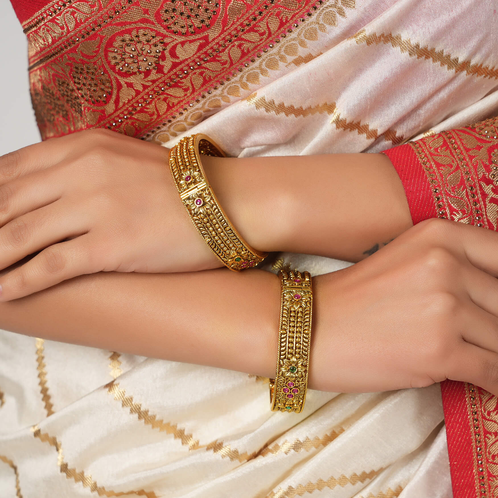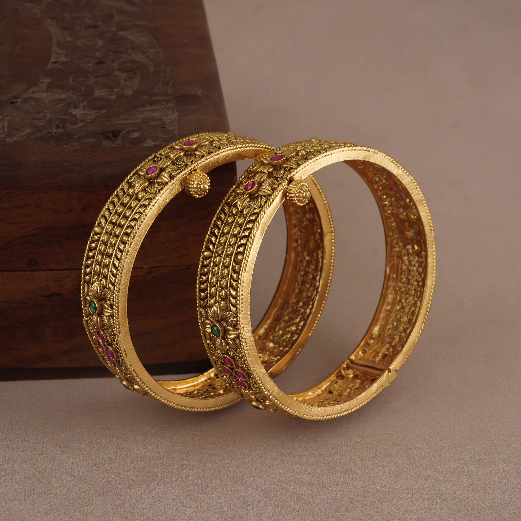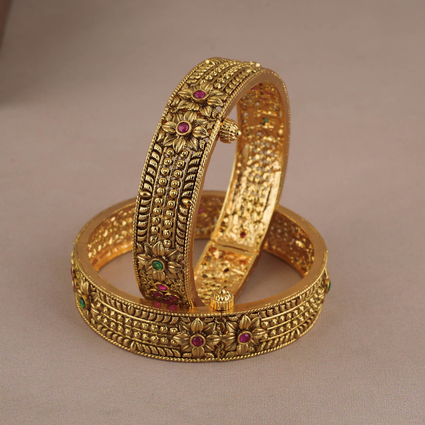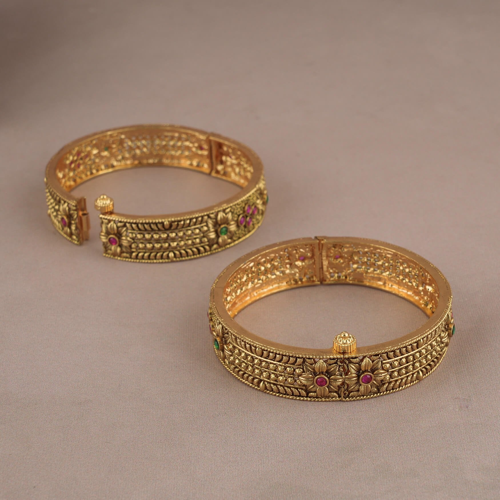 NOTE: This Royal antique gold multicolor stone openable bangle set    has been crafted by hand and may have slight irregularities or imperfections in color or embellishment. These irregularities are the result of human involvement in the process and add to the finished product's charm while ensuring you have a one-of-a-kind piece.