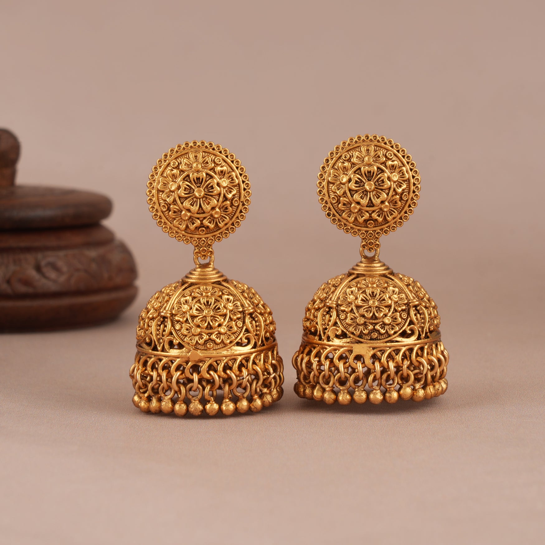 NOTE: These Royal antique gold plain carving jhumka earring  have been crafted by hand and may have slight irregularities or imperfections in colour or embellishment. These irregularities are the result of human involvement in the process and add to the finished product's charm while ensuring you have a one-of-a-kind piece.