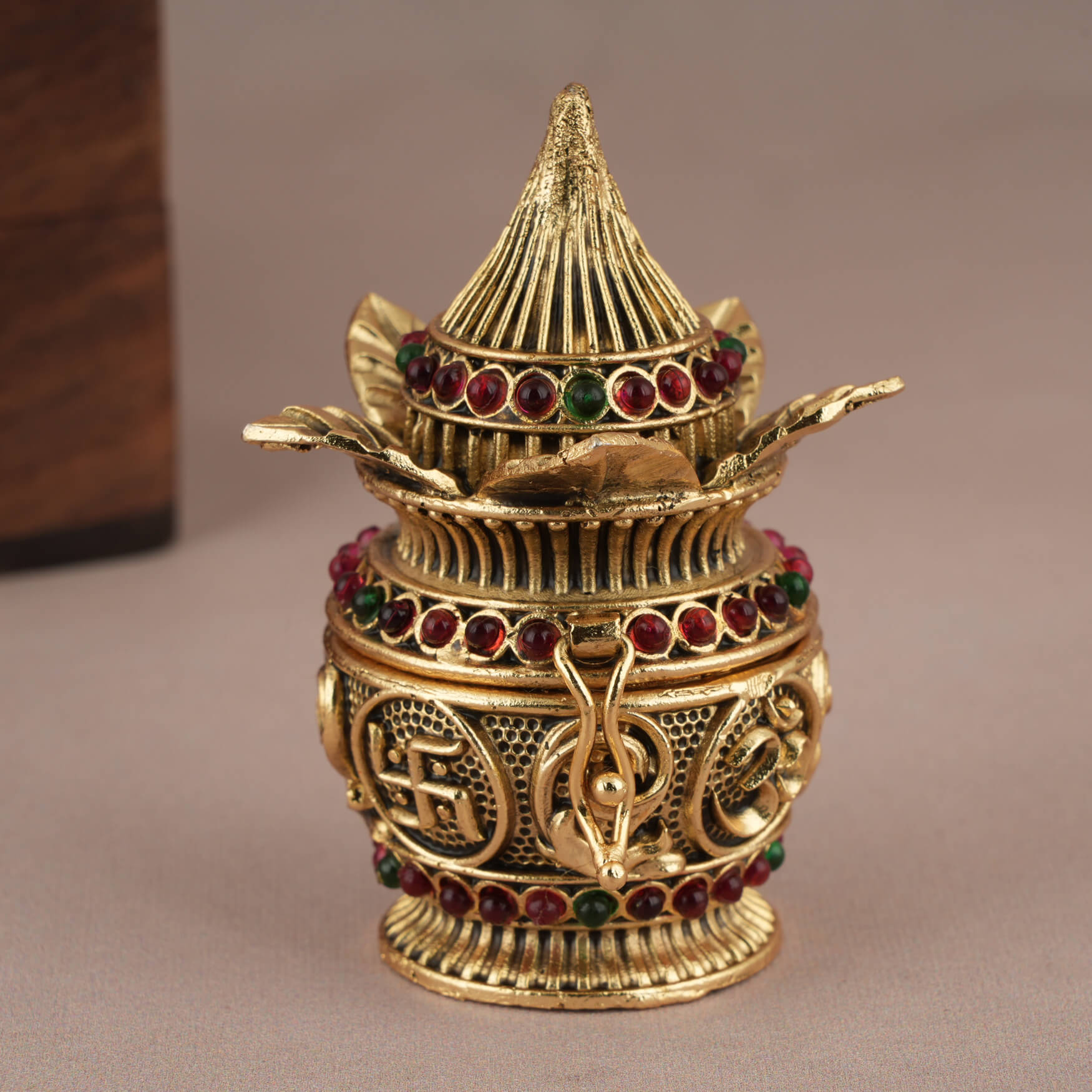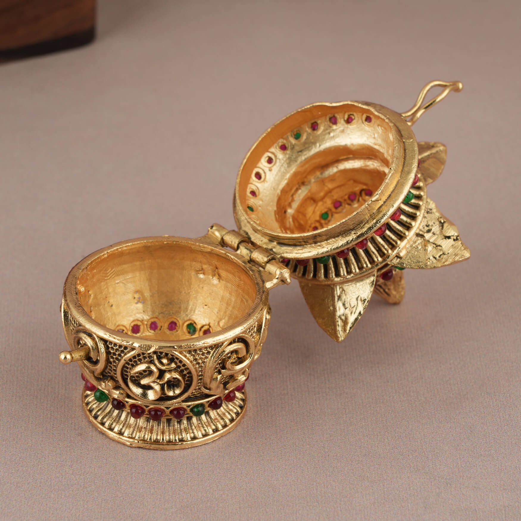 Royal antique gold Swastik Sindoor Dani   is made of brass alloy with gold plating. This Sindoor box  are  3.3 cm long. Royal antique gold Swastik Sindoor Dani   are show-stopping and come in traditional Indian design with gold plating and handwork.   Buy Royal antique gold Swastik Sindoor Dani and get free shipping even on Cash on Delivery.