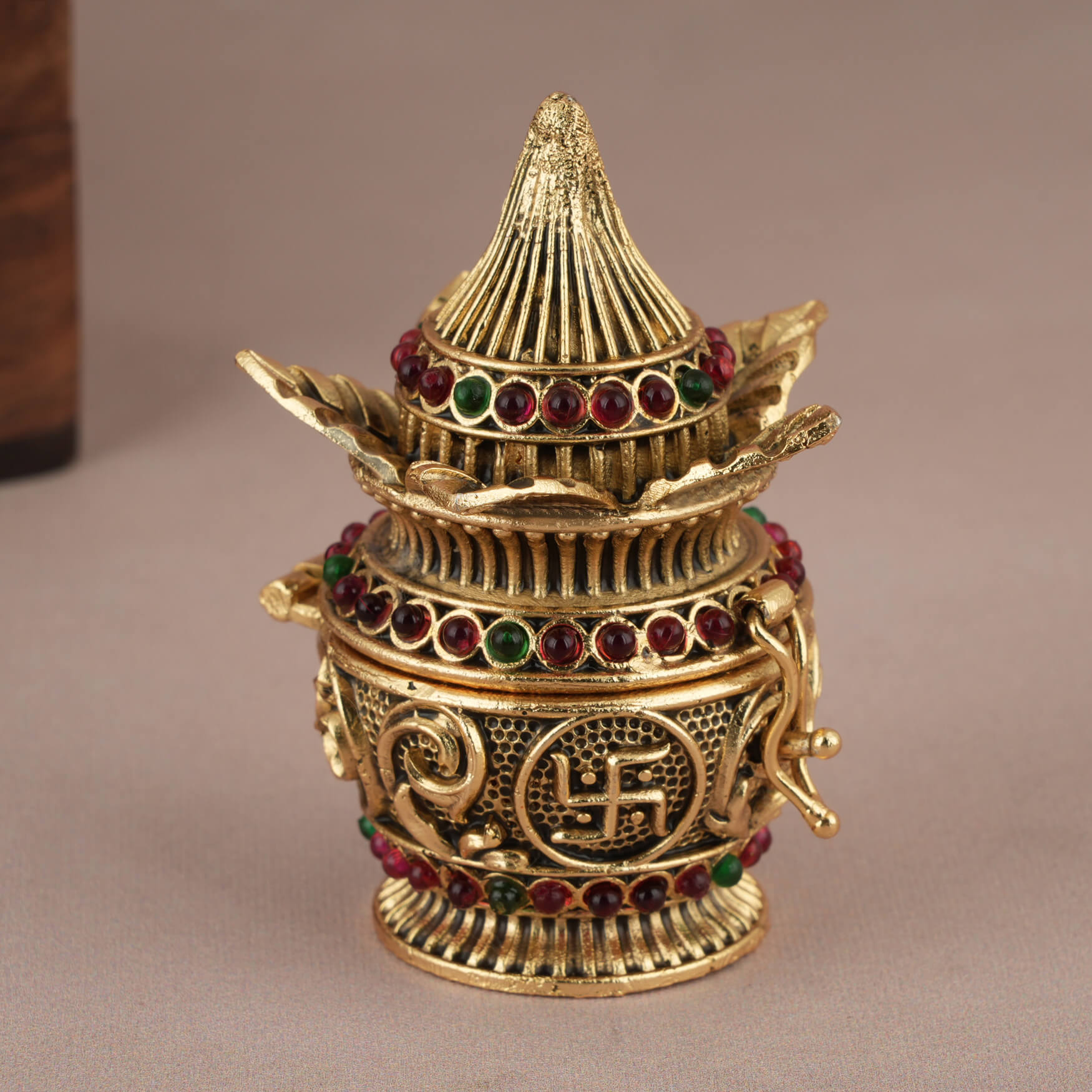 NOTE: This Royal antique gold Swastik Sindoor Dani  have been crafted by hand and may have slight irregularities or imperfections in color or embellishment. These irregularities are the result of human involvement in the process and add to the finished product's charm while ensuring you have a one-of-a-kind piece.