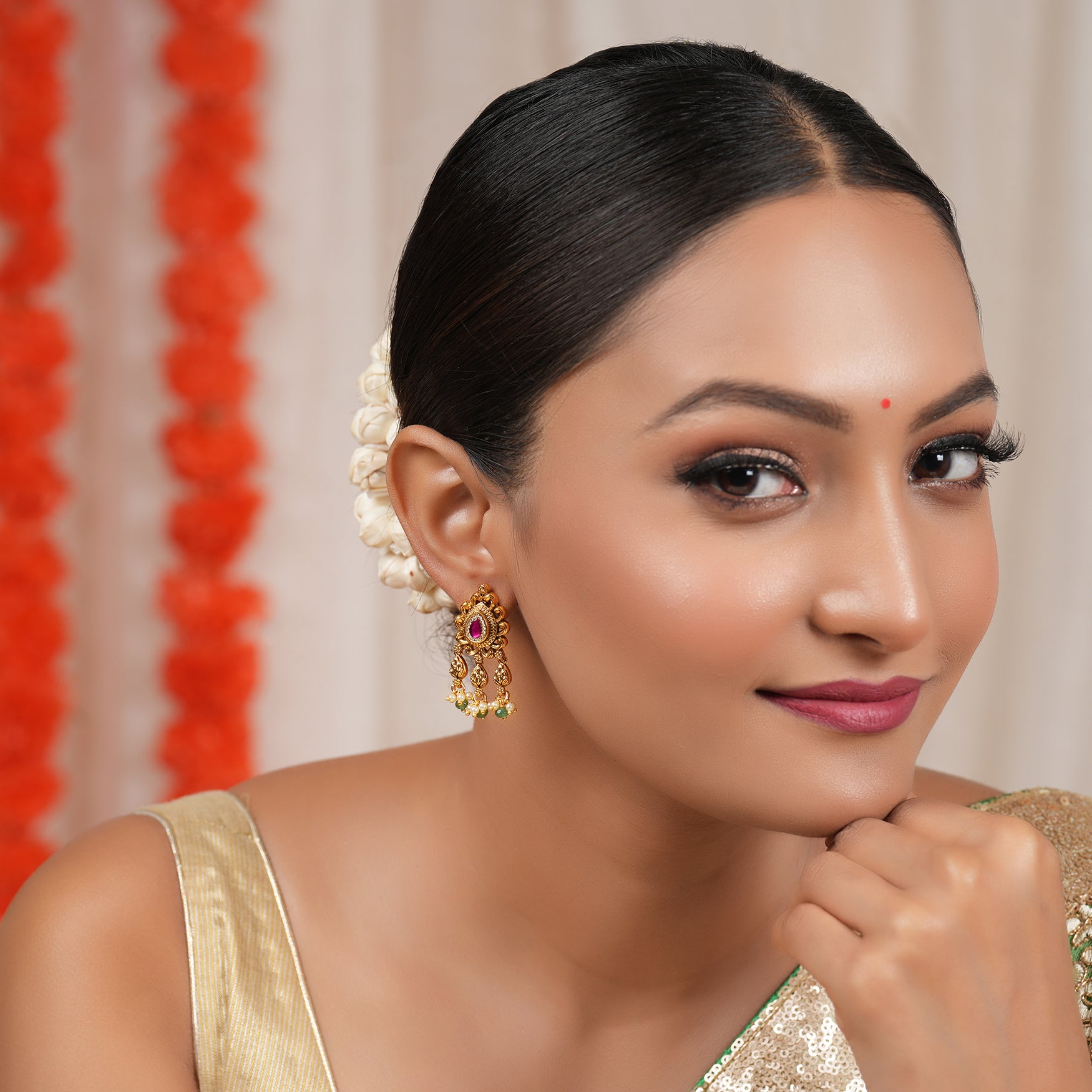 NOTE: These  Stone drop antique gold kundan earring    been crafted by hand and may have slight irregularities or imperfections in colour or embellishment. These irregularities are the result of human involvement in the process and add to the finished product's charm while ensuring you have a one-of-a-kind piece.