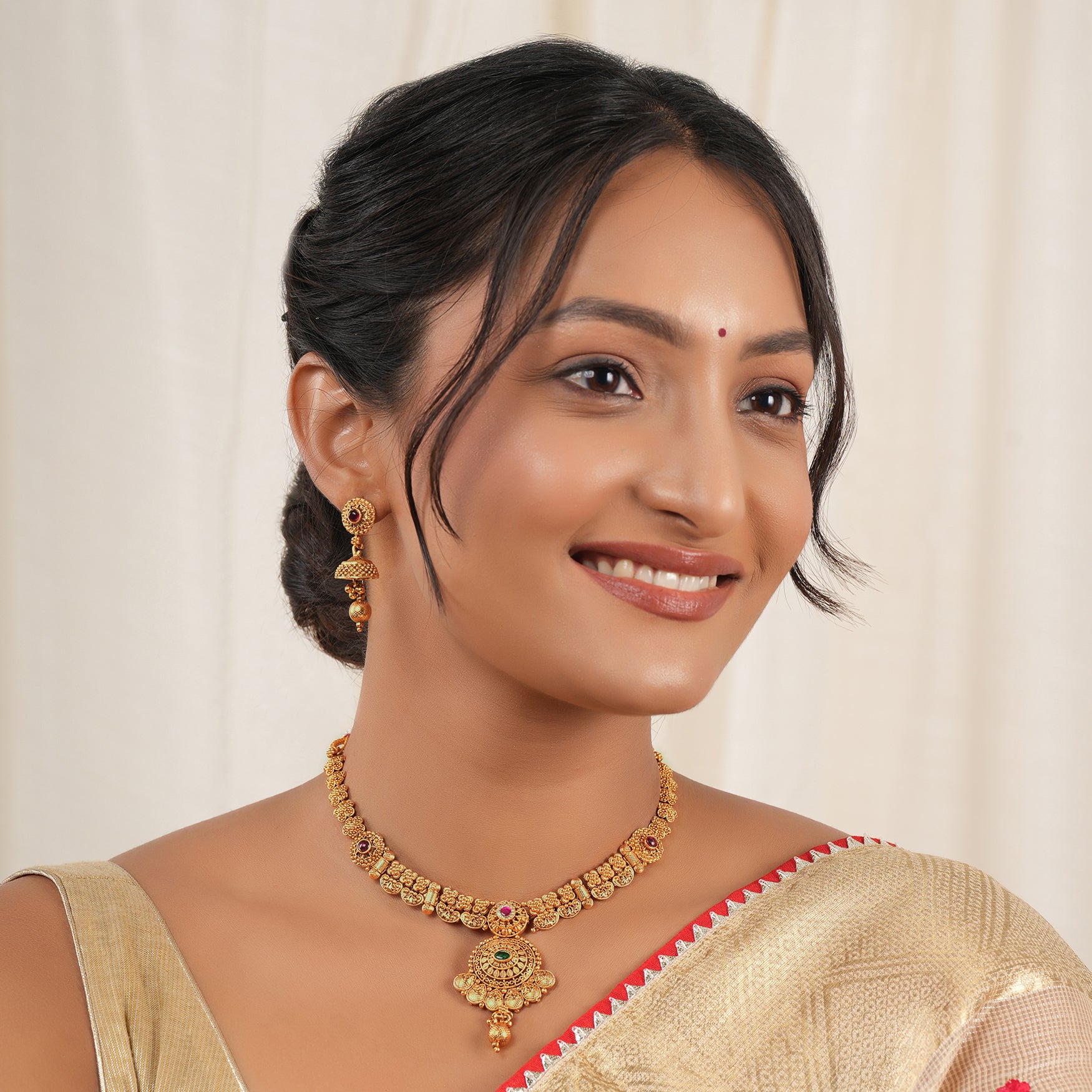 This set comes with beautiful pair of matching earrings Stunning antique gold aarori necklace set   is a show-stopping, traditional Indian necklace set with gold plating and handwork.