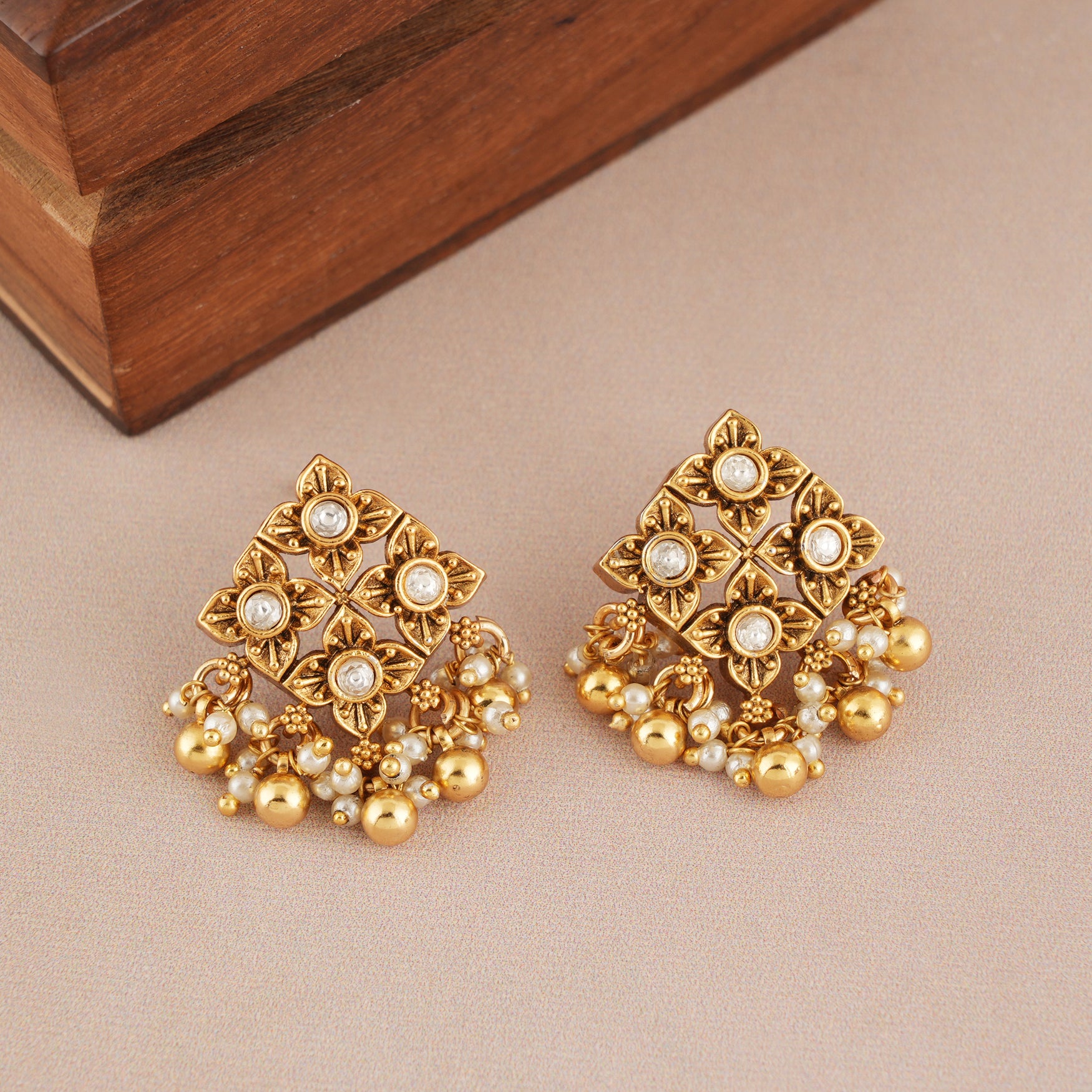 NOTE: These Stunning antique gold kundan stud earring been crafted by hand and may have slight irregularities or imperfections in colour or embellishment. These irregularities are the result of human involvement in the process and add to the finished product's charm while ensuring you have a one-of-a-kind piece.
