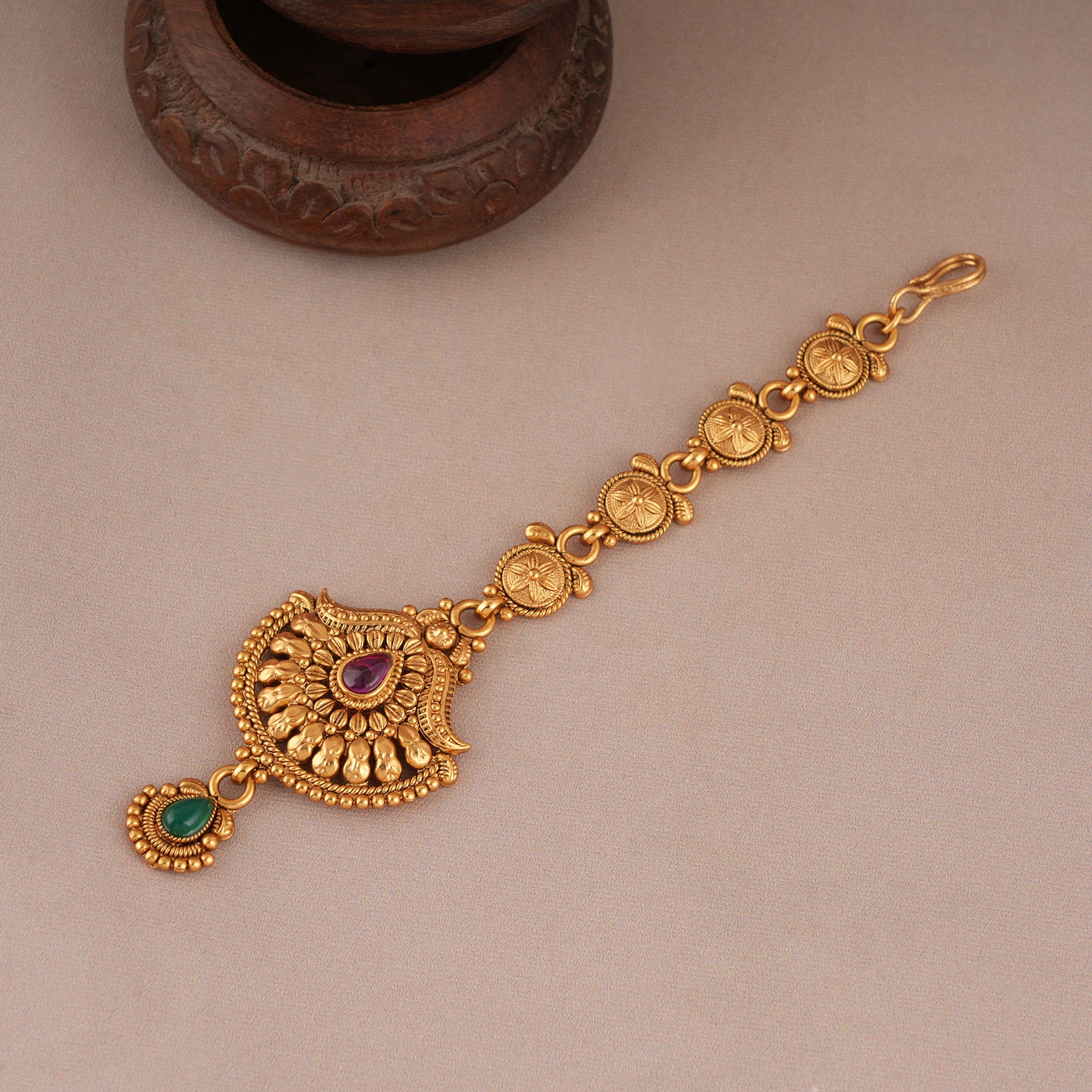 NOTE: This Stunning antique gold multicolor maangtika for women been crafted by hand and may have slight irregularities or imperfections in color or embellishment.