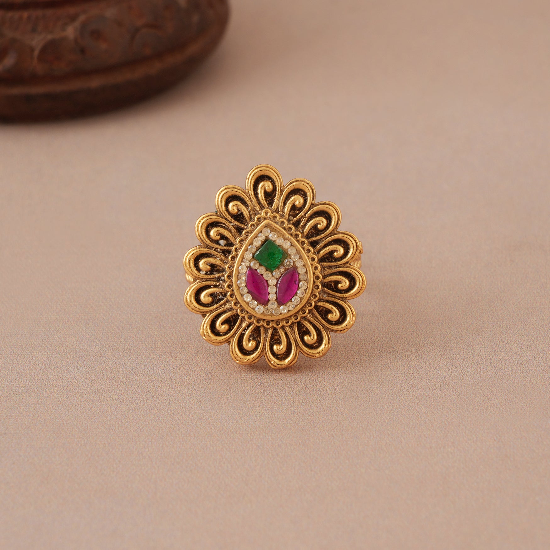 NOTE: This  Stunning antique gold multicolor stone pear shape finger ring   has been crafted by hand and Traditional beautiful antique gold finger ring have slight irregularities or imperfections in color or embellishment. These irregularities are the result of human involvement in the process and add to the finished product's charm while ensuring you have a one-of-a-kind piece.