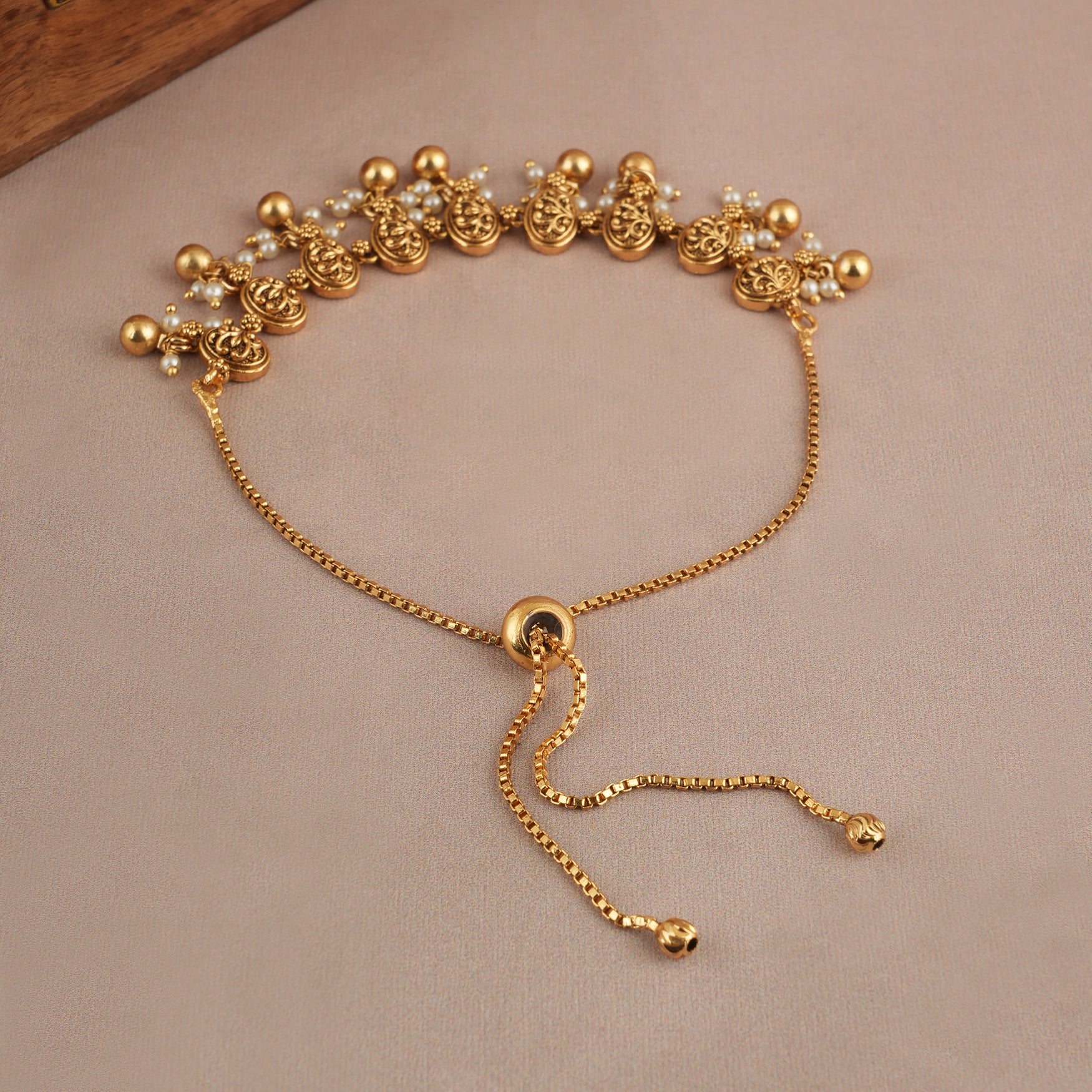 NOTE: This Buy this Stunning antique gold pearl bracelet has been crafted by hand and may have slight irregularities or imperfections in color or embellishment. These irregularities are the result of the human involvement in the process and add to the finished product's charm while ensuring you have a one-of-a-kind piece.