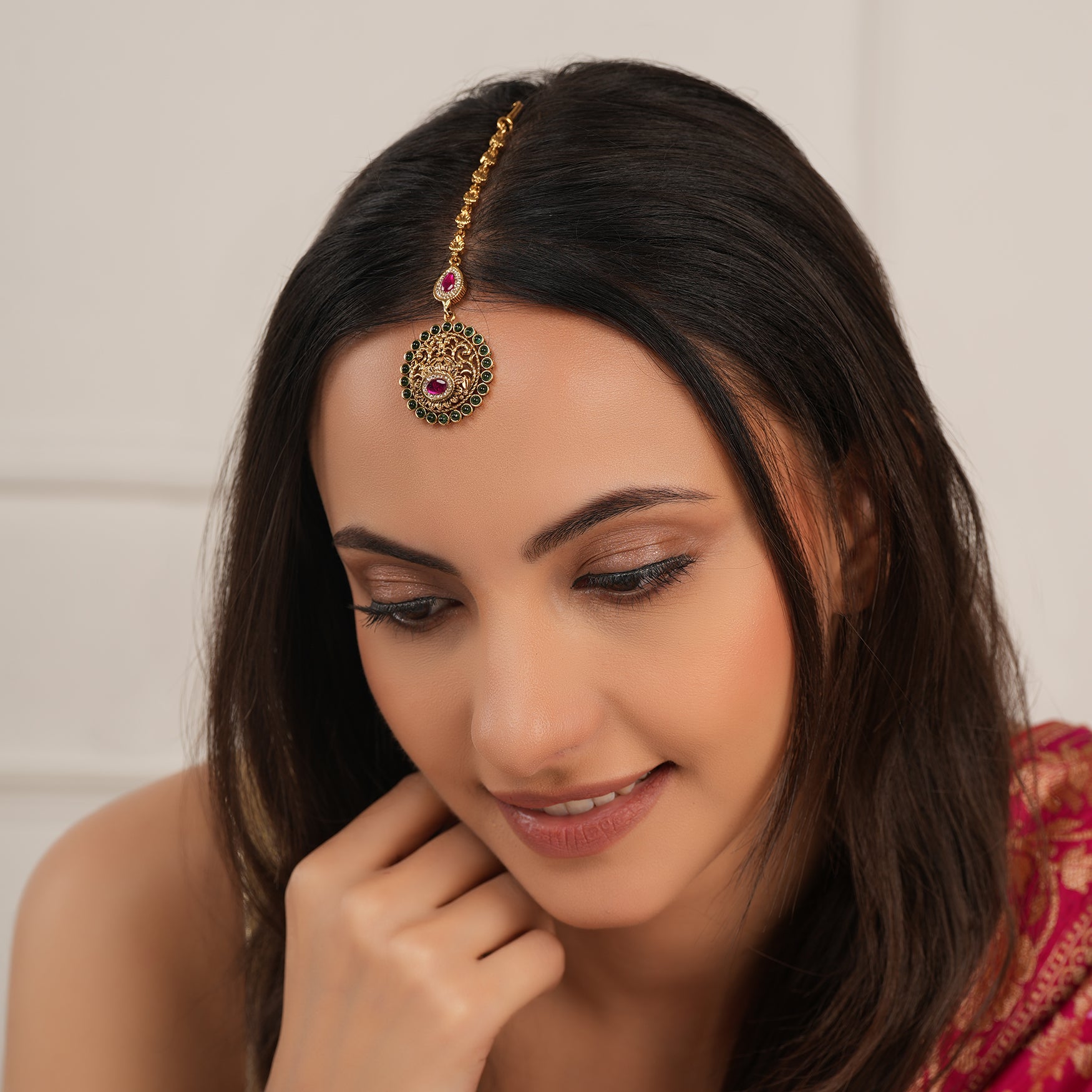 NOTE: This Stunning antique gold plated multicolor maangtika for women been crafted by hand and may have slight irregularities or imperfections in color or embellishment.