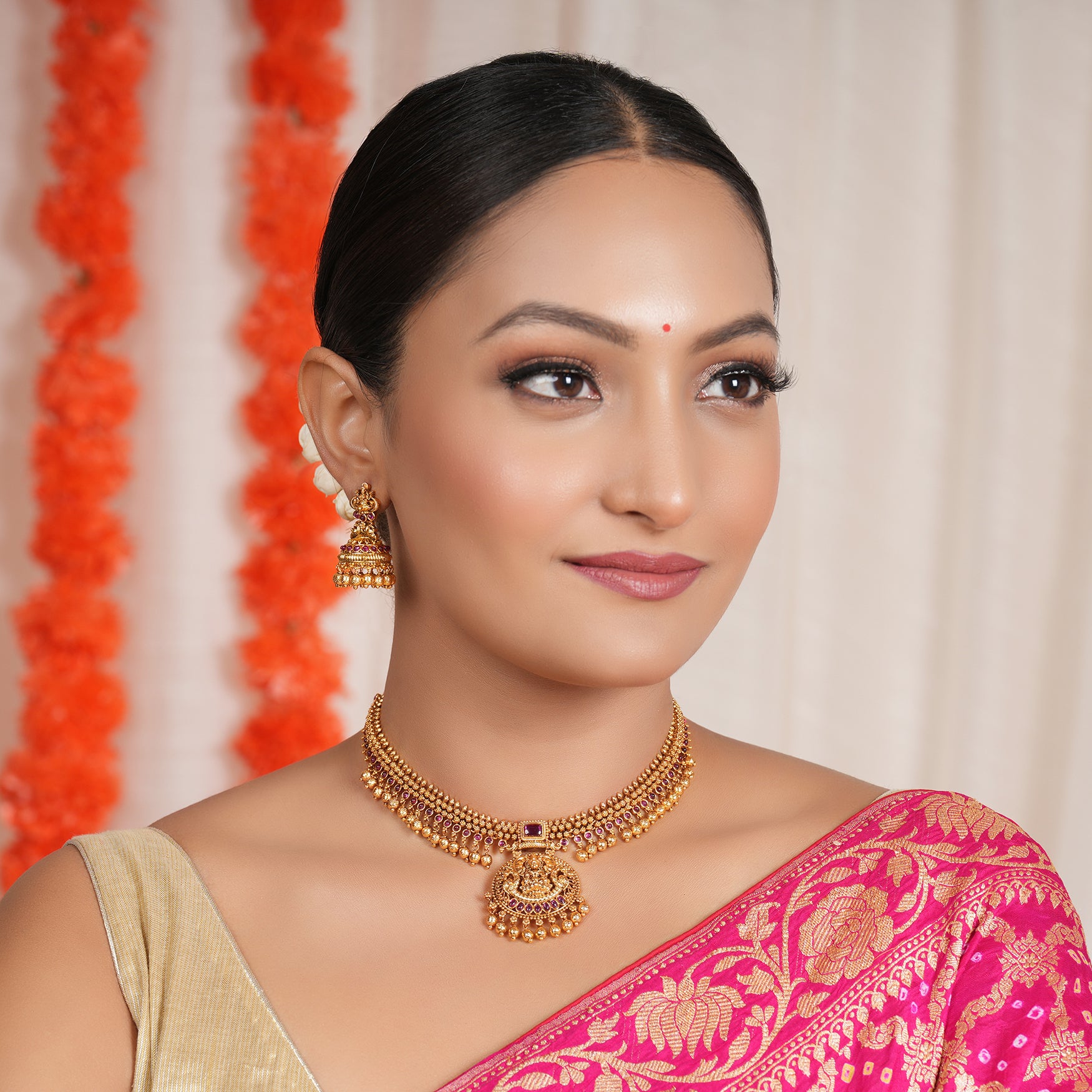 NOTE: These Stunning antique gold ruby traditional maa lakshmi necklace set I Temple Jewellery have been crafted by hand and may have slight irregularities or imperfections in color or embellishment. These irregularities are the result of human involvement in the process and add to the finished product's charm while ensuring you have a one-of-a-kind piece.