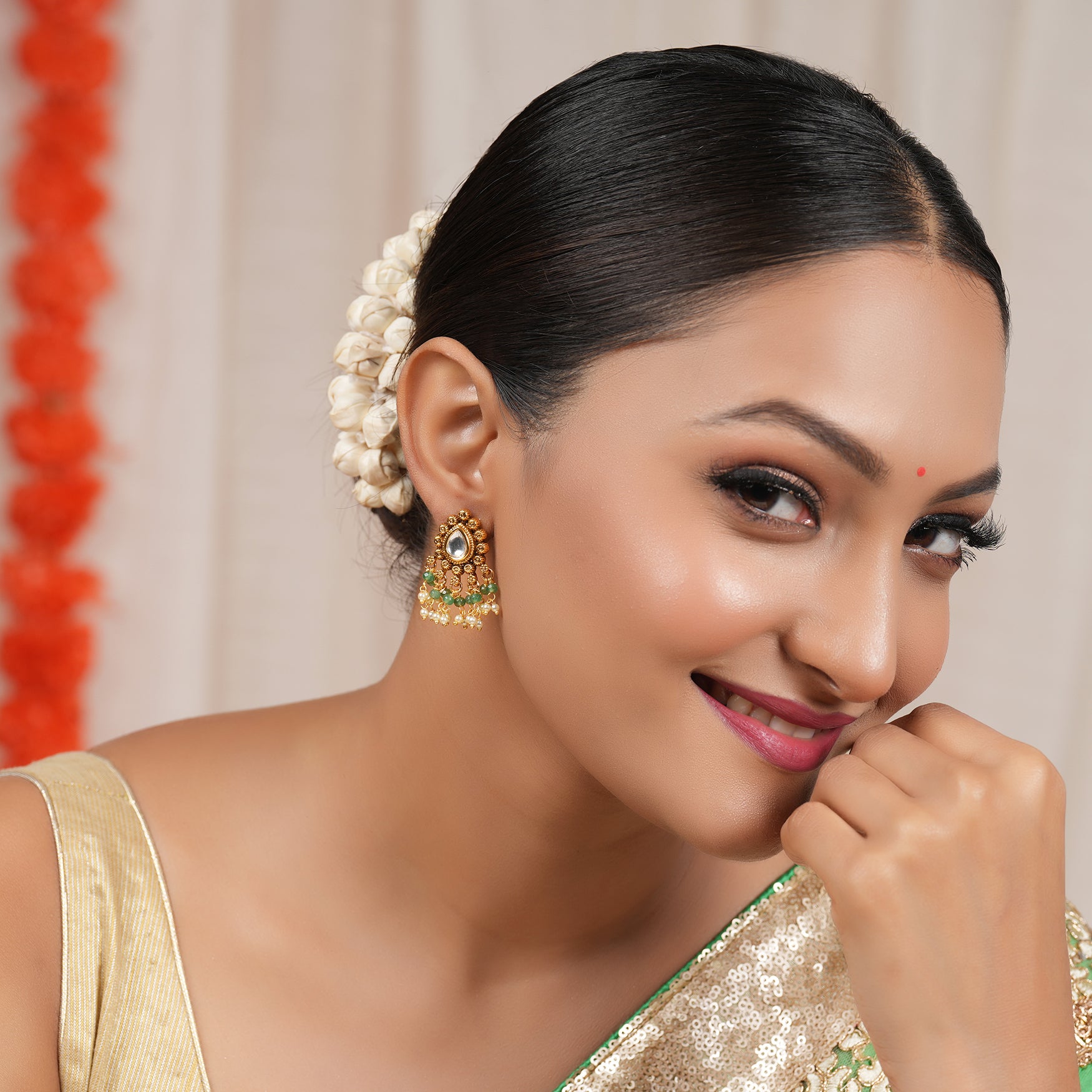 NOTE: These Stunning antique gold stone drop kundan earring have been crafted by hand and may have slight irregularities or imperfections in color or embellishment. These irregularities are the result of human involvement in the process and add to the finished product's charm while ensuring you have a one-of-a-kind piece.